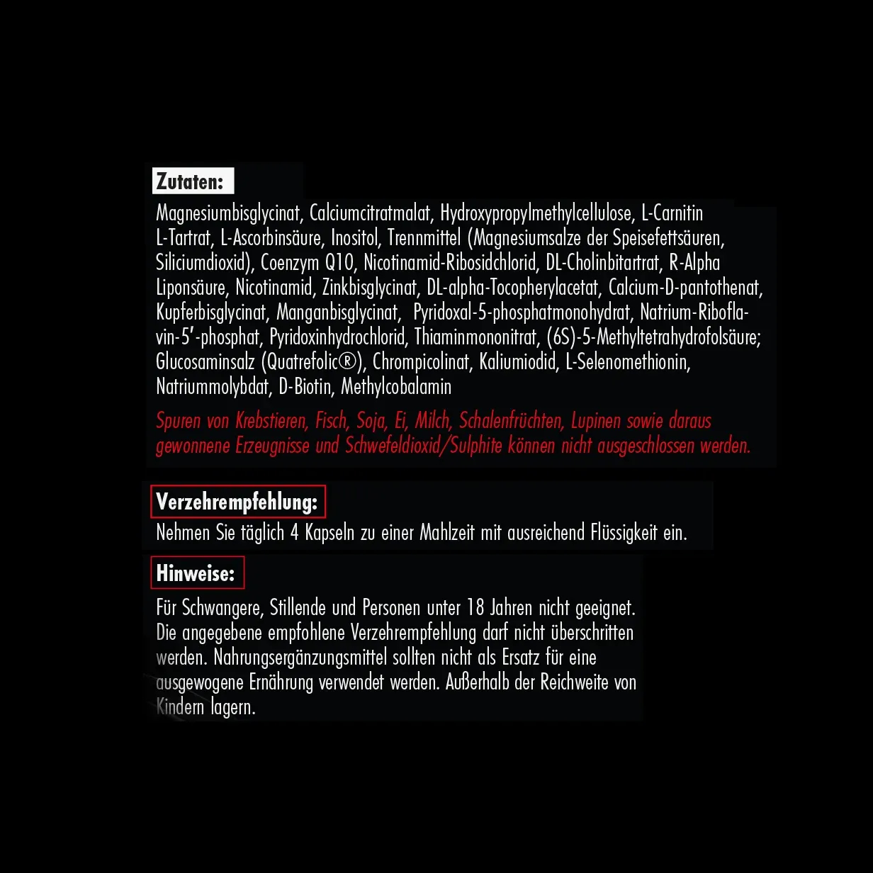 Mikrokristalline Cellulose, Magnesiumoxid, Hydroxypropylmethylcellulose (Kapselhülle), L-Carnitin-L-Tartrat, L-Ascorbinsäure, DL-alpha-Tocopherylacetat, Inositol, Zinkbisglycinat, Nicotinamid, Cholinbitartrat, Calciumcarbonat, Eisenbisglycinat, Calcium-D-Pantothenat, R-Alpha-Liponsäure, Mangangluconat, Beta-Carotin, Kupfergluconat, Coenzym Q10, Thiaminmononitrat, Pyridoxinhydrochlorid, Riboflavin, Pteroylmonoglutaminsäure, D-Biotin, Natriumselenit, Nicotinamid-Ribosid-Chlorid, Cholecalciferol, Cyanocobalamin.