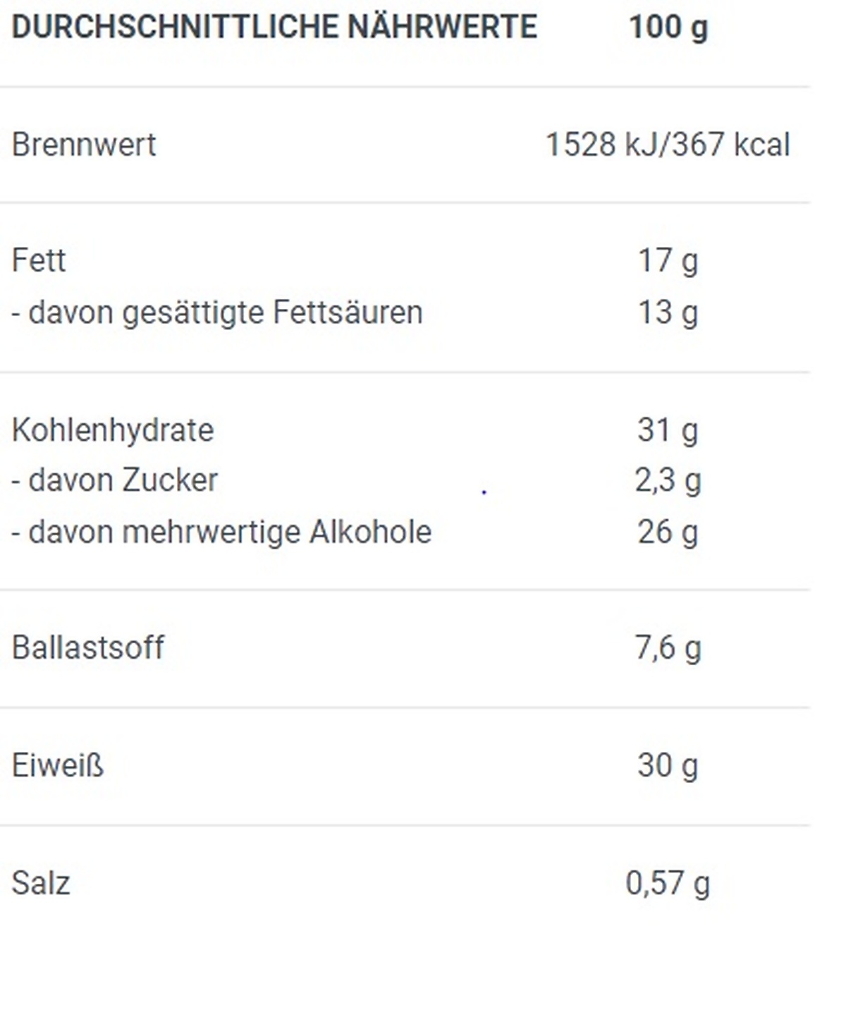 Geschmacksrichtung: Doppelte Schokolade: Feuchthaltemittel (Maltit, Glycerin), Überzug [Süßungsmittel (Maltit), ganz gehärtete Pflanzliche Fette (Kokosnuss, Raps), fettarmes Kakaopulver, Emulgator (Lecithin)], Molkenproteinkonzentrat, Milcheiweißkonzentrat, Fructo-Oligosaccharide, hydrolisiertes Kollagen, raffiniertes Kokosöl, fettarmes Kakaopulver, Molkenproteinisolat [Molkenproteinisolat, Emulgator: Lecithine (Soja)], Trinkwasser, Mandelmehl, Emulgator: Lecithine (Soja), Füllstoff (Carrageen), Aromen, Konservierungsstoff (Kaliumsorbat), Stabilisator (Kaliumchlorid), Antioxidationsmittel (Alpha-Tocopherol), Süßungsmittel (Sucralose).
