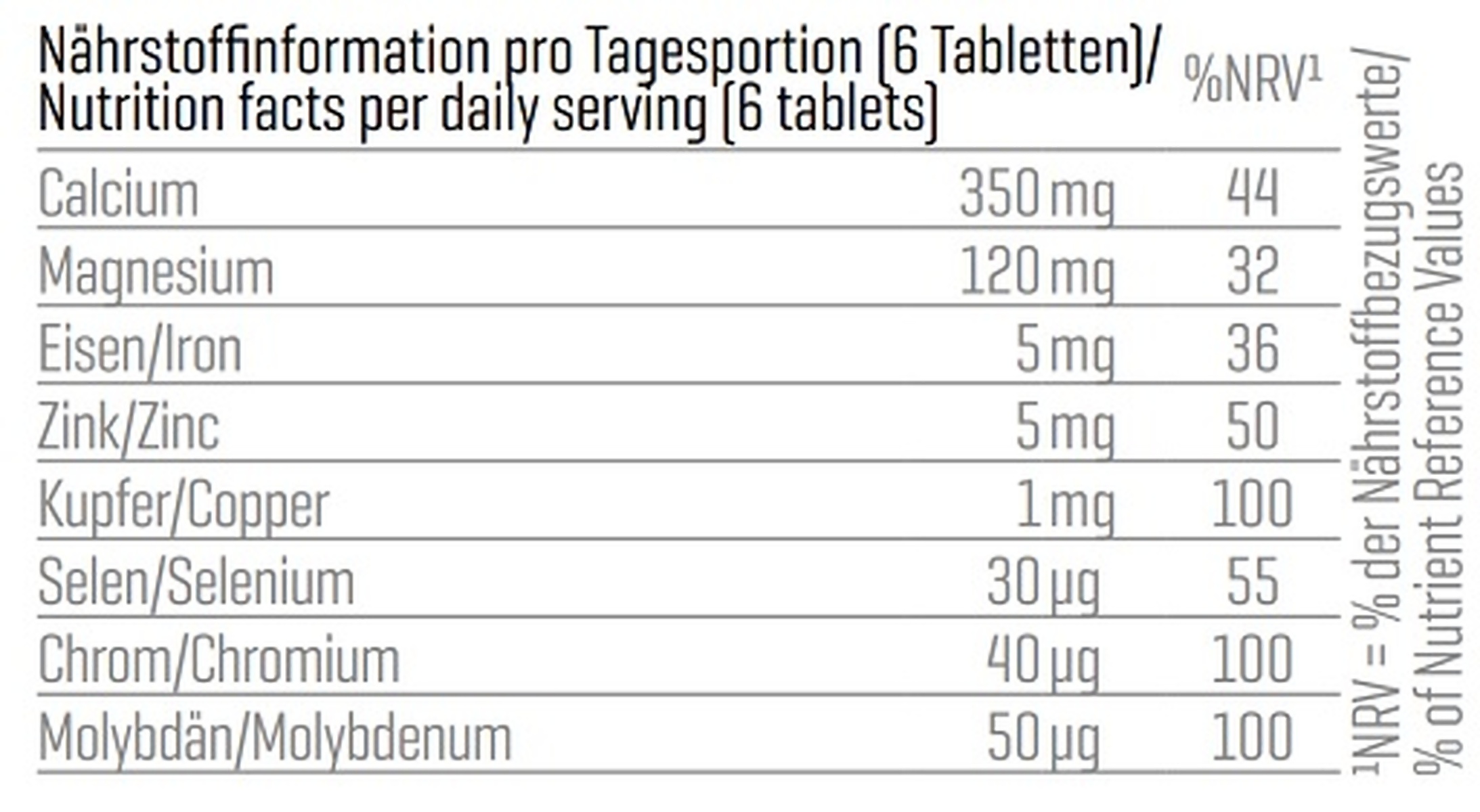 Calciumcitrat, Füllstoff (Cellulose), Magnesiumcitrat, Magnesiumoxid, pflanzliches Fett (Palm (ganz gehärtet)), Trennmittel (Magnesiumsalze der Speisefettsäuren), Stabilisator
