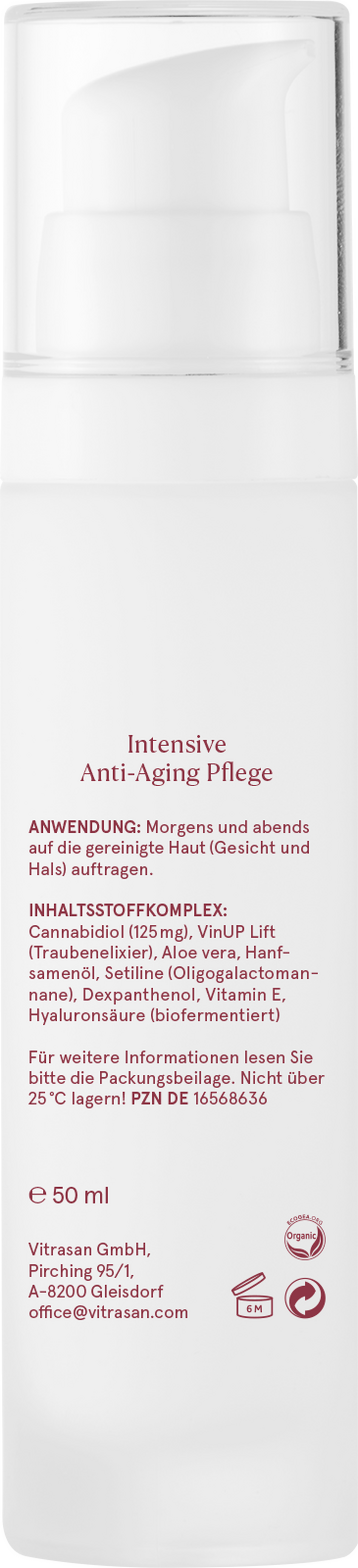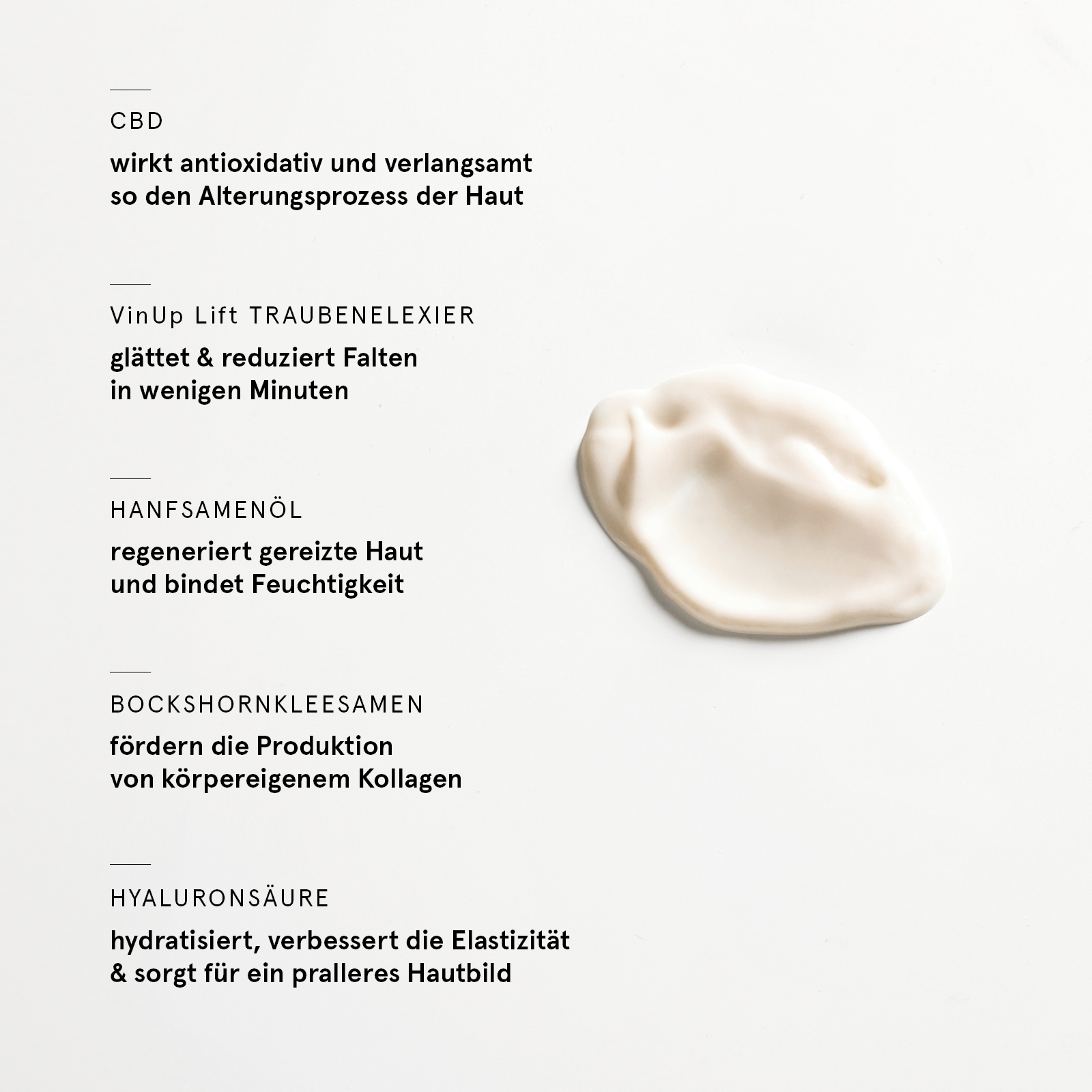 Inhaltsstoffkomplex: Cannabidiol, VinUP Lift (Traubenelixier), Aloe Vera, Hanfsamenöl, Setiline (Oligogalactomannane), Dexpanthenol, Vitamin E, Hyaluronsäure (biofermentiert).