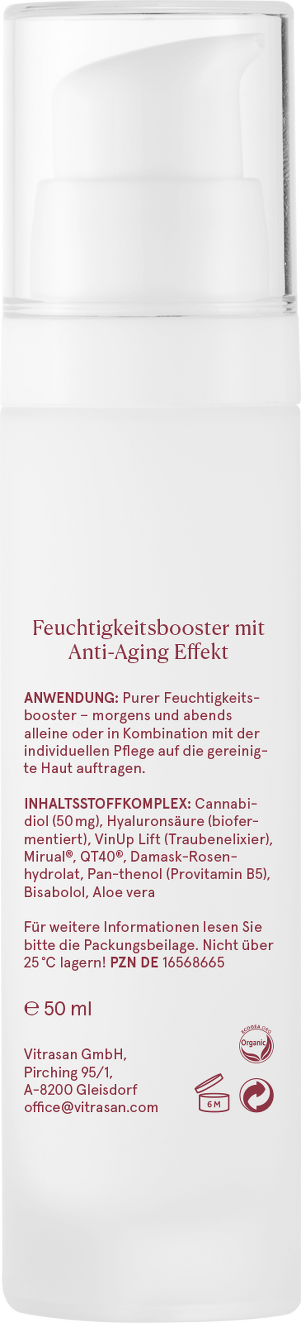 Aktivstoffkomplex: Cannabidiol (50 mg), Hyaluronsäure (biofermentiert), VinUp Lift (Traubenelixier), Mirual®, QT40, Damask-Rosenhydrolat, Panthenol (Provitamin B5), Bisabolol, Aloe Vera