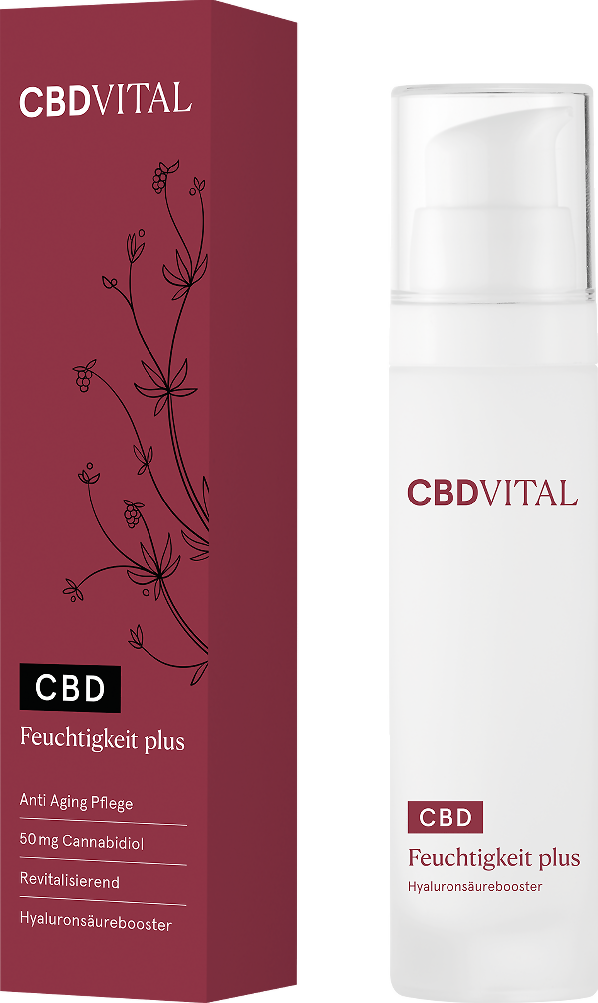 CBD VITAL Feuchtigkeit plus für intensive und nachhaltige Feuchtigkeit zur Reduktion von Spannungsgefühlen, rauer Haut und Falten, bedingt durch Trockenheit. Cannabidiol (CBD) aus der Hanfpflanze ist das neue Schönheits-Geheimnis für anspruchsvolle Haut und hilft dabei schädliche Auswirkungen durch äußere Faktoren auf die Haut zu vermeiden. Die körpereigenen Anti-Aging Kräfte werden durch das sogenannte Eiswein-Elixier VinUp Lift aktiviert- für ein frisches Erscheinungsbild innerhalb von Minuten. Mirual® aus Seealgen versorgt die Haut mit wertvollen Meeresmineralien und stellt die Feuchtigkeitsbalance wieder her. QT40® aus Meersalat fördert die Hautelastizität und revitalisiert gemeinsam mit Hyaluronsäure die Haut. Panthenol und reizlinderndes Bisabolol regenerieren die Hautoberfläche. Aloe und Rosenhydrolat versorgen die Gesichtshaut zusätzlich mit Feuchtigkeit.