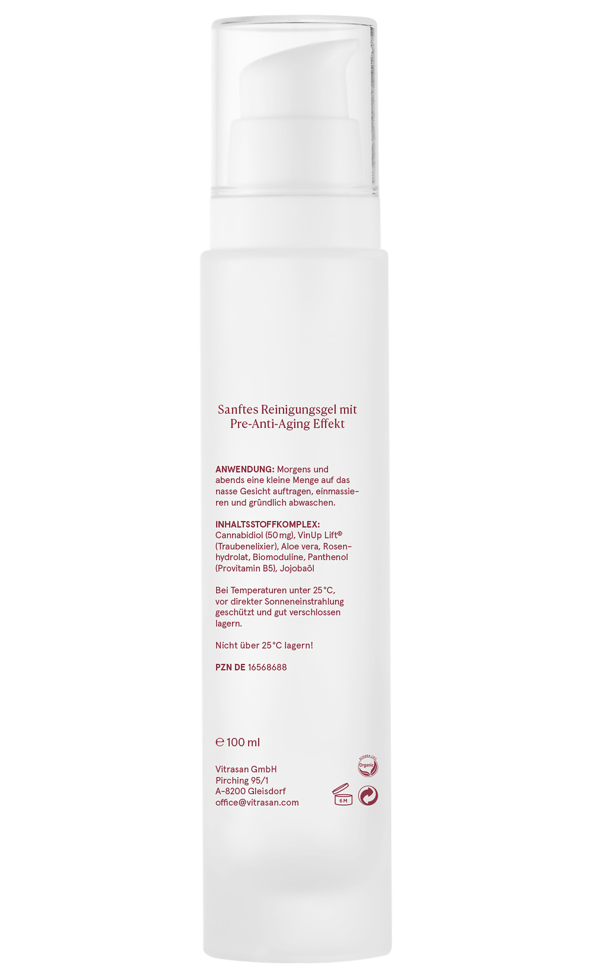 Inhaltsstoffkomplex: Cannabidiol (50 mg), VinUp Lift (Traubenelixier), Aloe Vera, Rosenhydrolat, Biomoduline, Panthenol (Provitamin B5), Jojobaöl