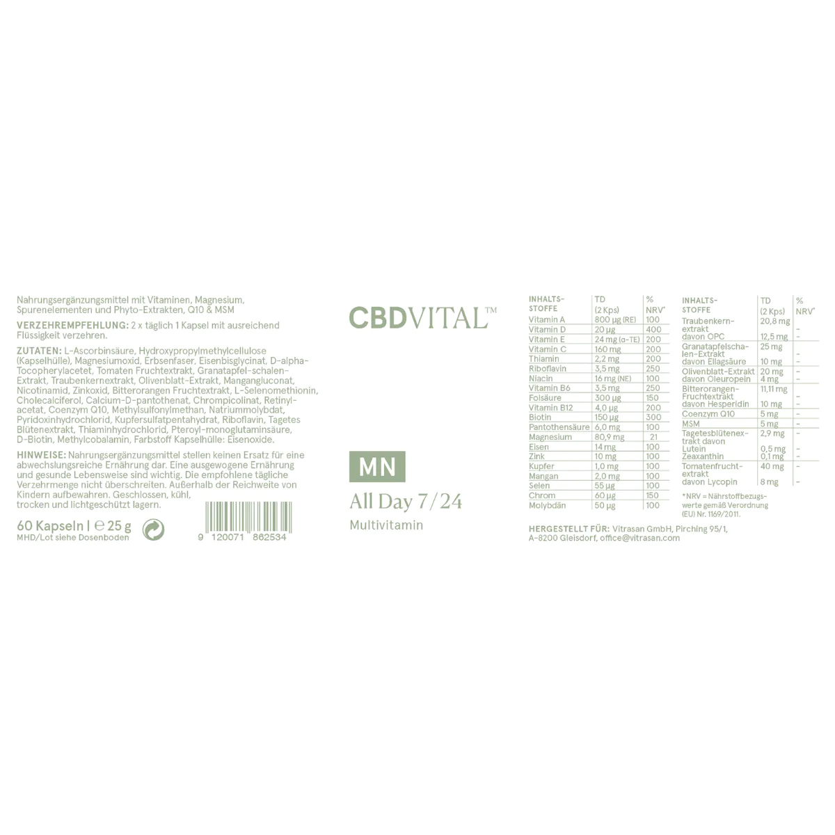 All Day 7/24 von CBD VITAL versorgt Sie mit wichtigen Mikronährstoffen. All Day 7/24 ist die Basisversorgung, welche perfekt auf unsere heutigen Lebensgewohnheiten abgestimmt ist. Zusätzlich unterstützt das innovative Multivitamin die Deckung eines erhöhten Mikronährstoffmehrbedarfs.