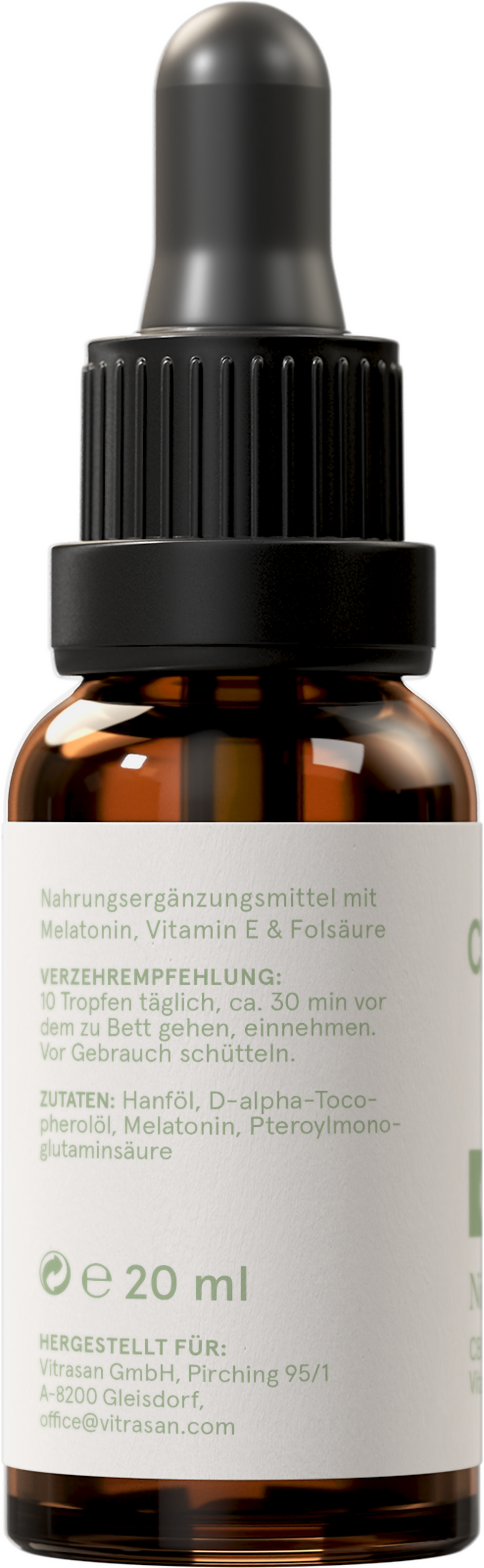 Nährstoffkomplex mit Melatonin, Hanföl, Folsäure und Vitamin E. Verkürzt die Einschlafzeit.