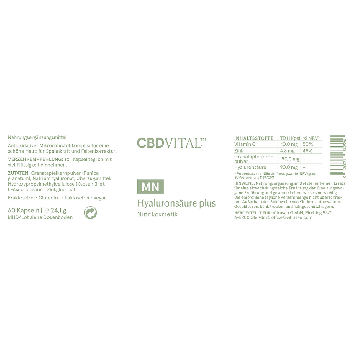 • Inhaltsstoffe TD (1 Kapsel) % NRV* Vitamin C 40 mg 50 % Zink 5 mg 50 % Granatapfelkernmehl 150 mg - Hyaluronsäure 90 mg - *NRV = Nährstoffbezugswerte gemäß Verordnung (EU) Nr. 1169/2011.