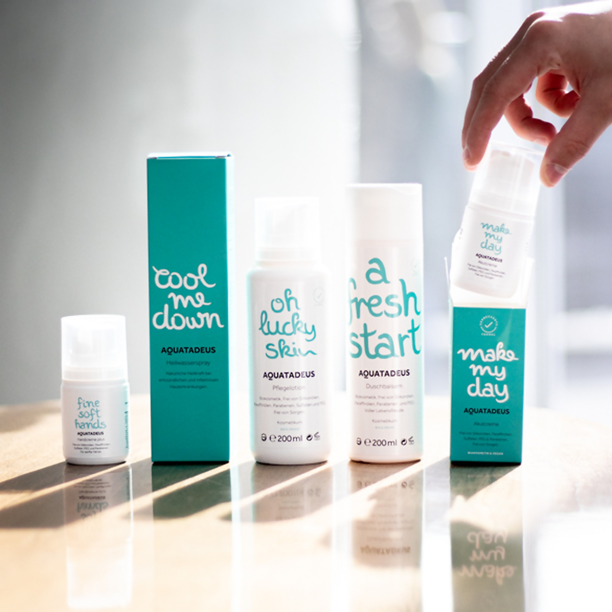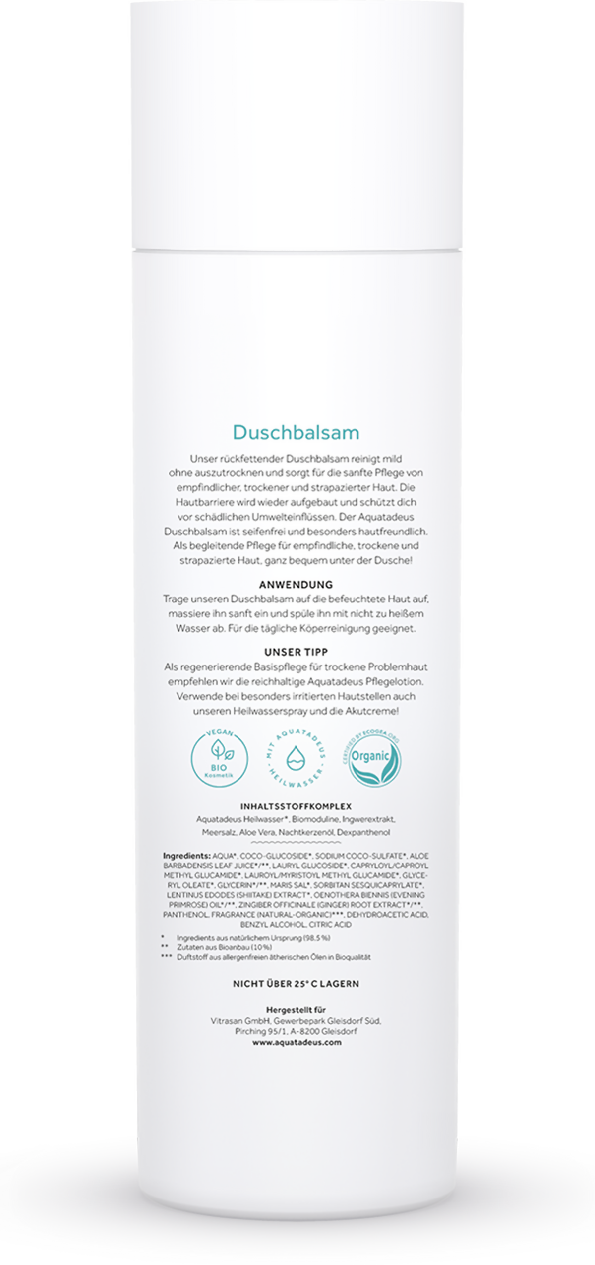 Als optimale Therapiebegleitung bei Neurodermitis, Psoriasis (Schuppenflechte) und Ekzemen, ganz bequem unter der Dusche. Für die tägliche Gesichts- und Köperreinigung. Optimal für trockene, sensible Haut. Den Duschbalsam auf die befeuchtete Haut auftragen, sanft einmassieren und mit nicht zu heißem Wasser abspülen. Als regenerierende Basispflege für trockene Problemhaut empfehlen wir dazu die reichhaltige Aquatadeus Pflegelotion.