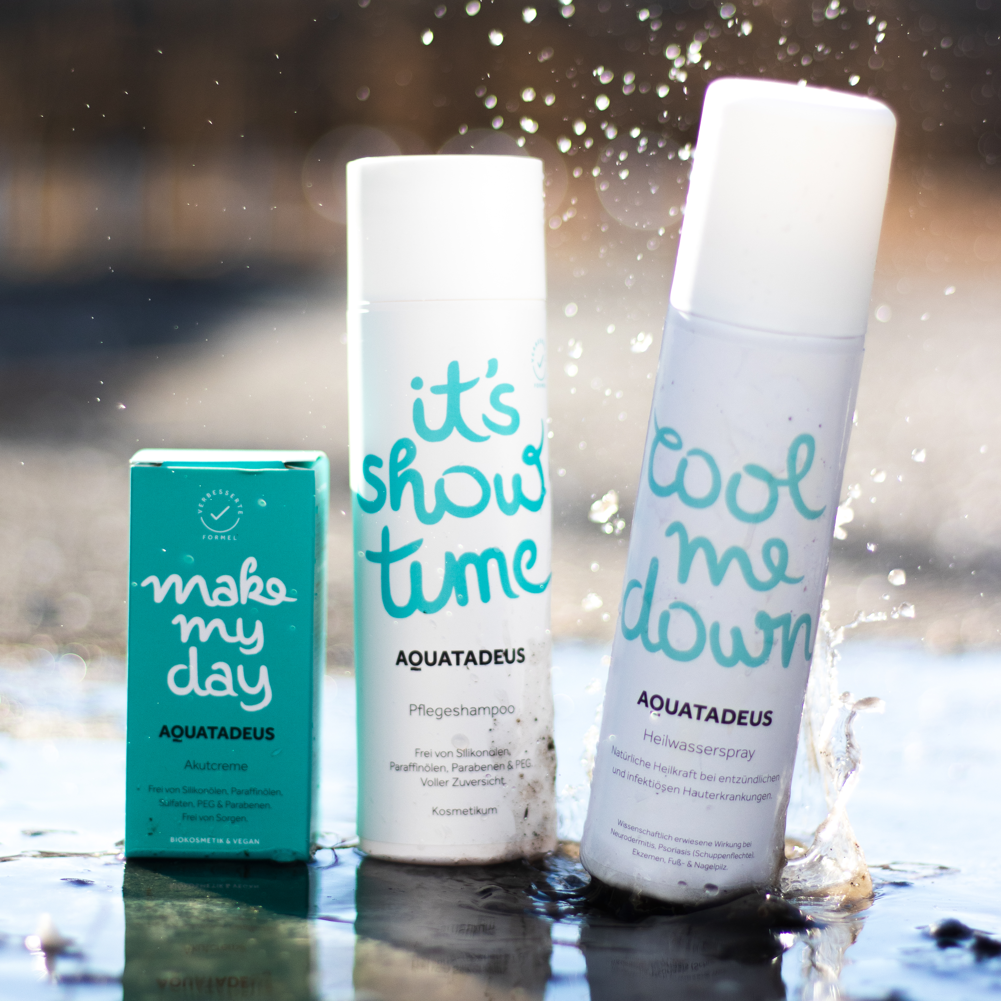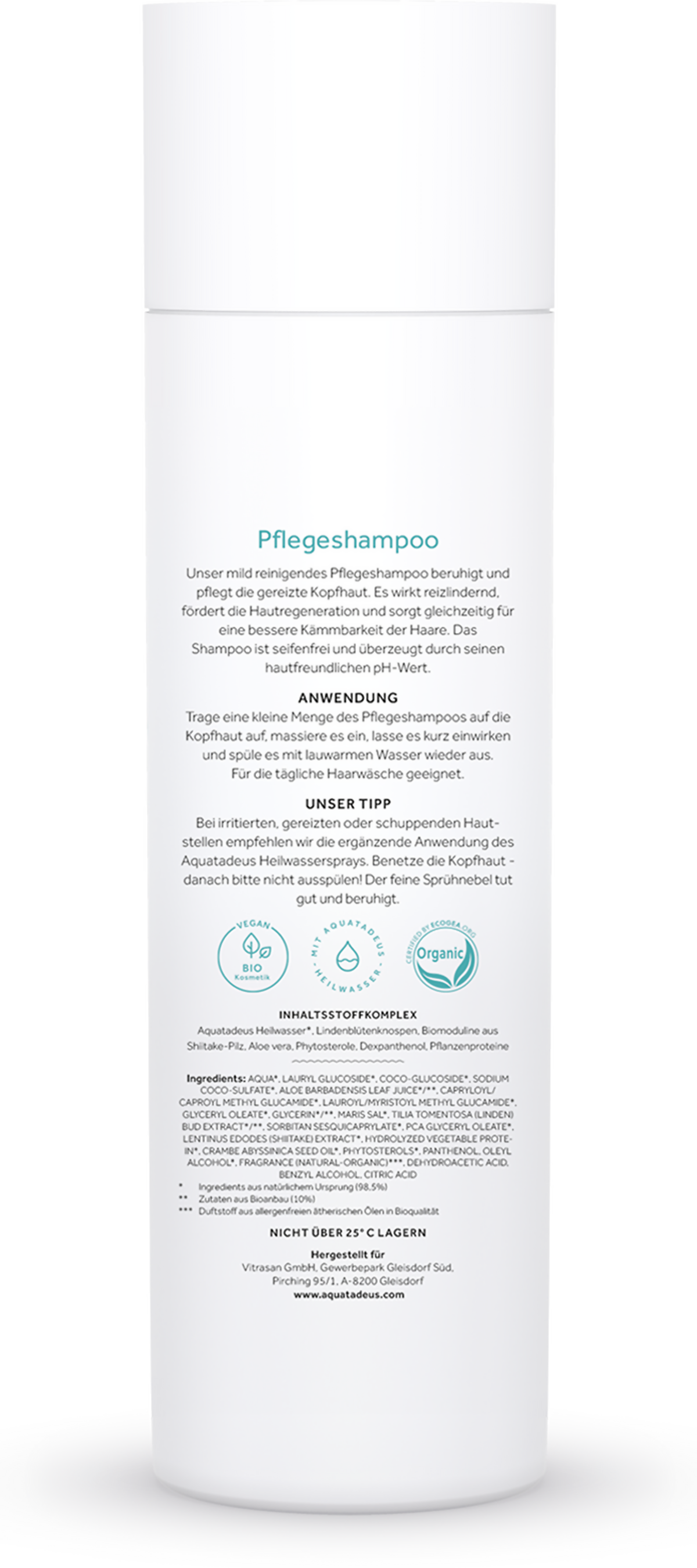 Als begleitende Pflege bei Neurodermitis, Psoriasis (Schuppenflechte) und Ekzemen, ganz bequem unter der Dusche. Eine kleine Menge des Pflegeshampoos auf die Kopfhaut auftragen, sanft einmassieren und kurz einwirken lassen. Danach mit lauwarmem Wasser wieder ausspülen. Für die tägliche Haarwäsche geeignet. Bei irritierten, gereizten oder schuppenden Hautstellen empfehlen wir die ergänzende Anwendung des Aquatadeus Heilwassersprays. Die Kopfhaut mit dem Heilwasser nach der Haarwäsche befeuchten - danach bitte nicht ausspülen!