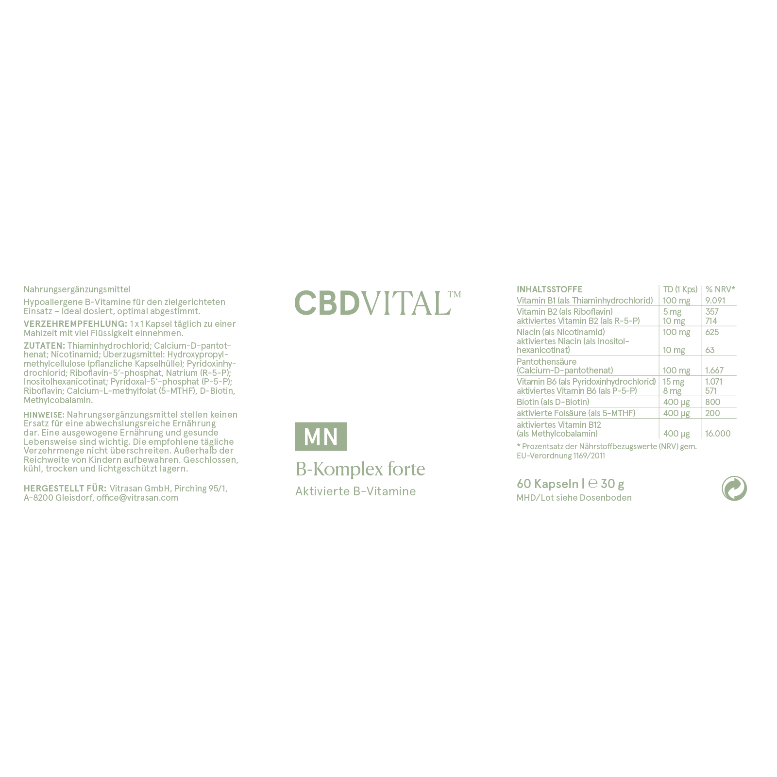 Der B-Komplex forte von CBD VITAL besteht aus allen 8 essenziellen B-Vitaminen. Dadurch, dass die Mikronährstoffe in aktivierter Form in den Kapseln vorliegen, wird die Aufnahme im Körper erhöht und die B-Vitamine stehen rasch für verschiedene Prozesse zur Verfügung.