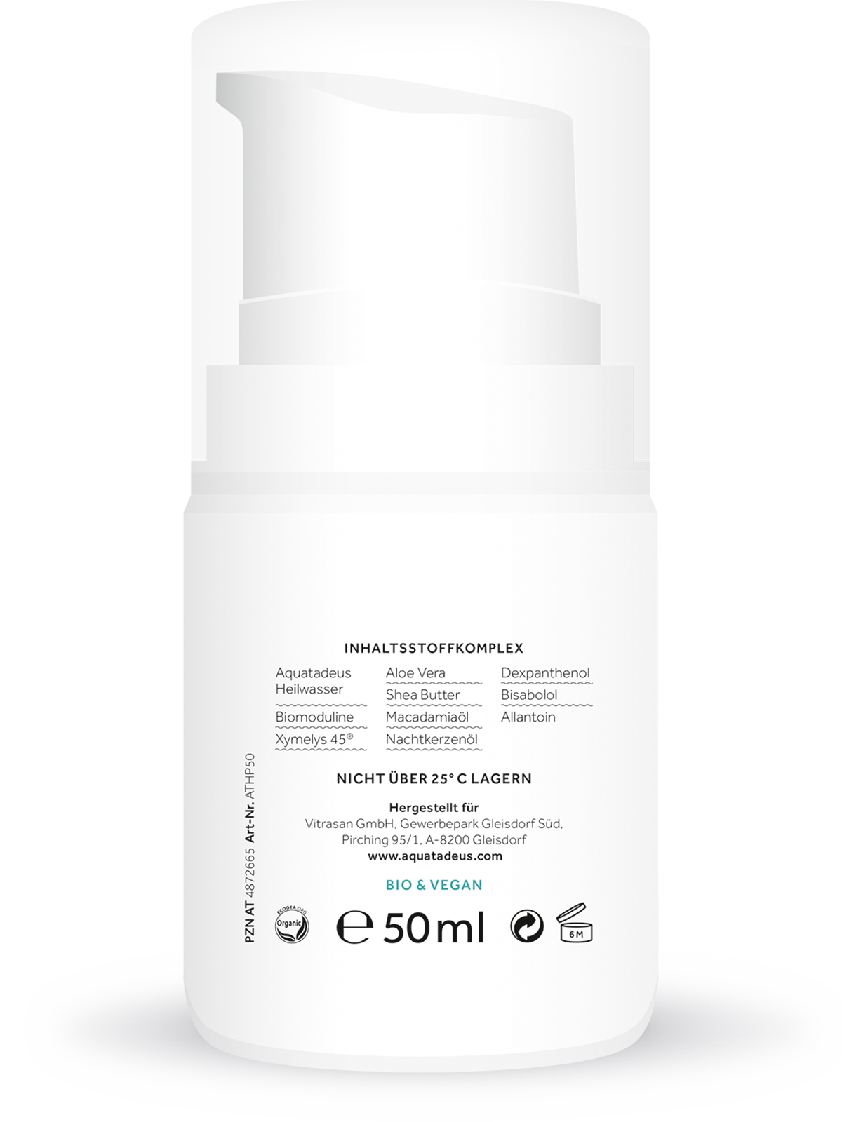 Inhaltsstoffkomplex: Aquatadeus Heilwasser*, Biomoduline aus Shiitake-Pilz, Xymelys 45® aus Ximenia-Rinde, Aloe Vera, Sheabutter, Macadamiaöl, Nachtkerzenöl, Dexpanthenol, Bisabolol, Allantoin
