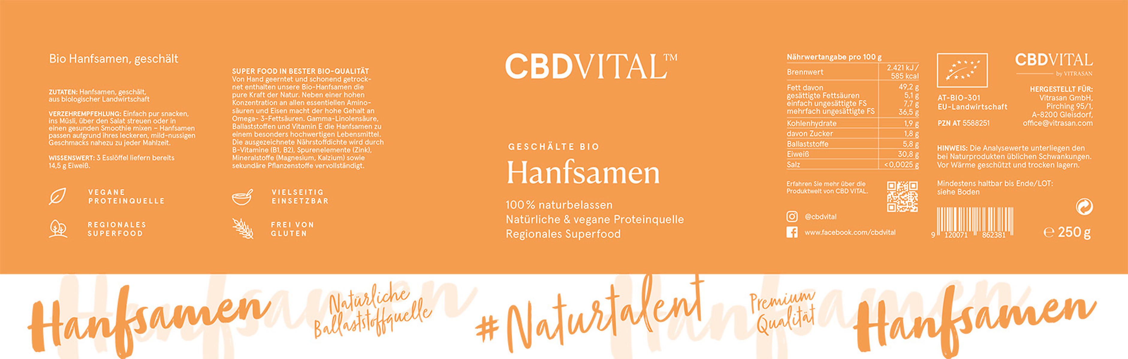 Ob zum Müsli, im Salat, im Smoothie oder einfach als Snack für Zwischendurch: Das heimische „Super Food“ von CBD VITAL zeichnet sich durch eine hohe Konzentration an allen essenziellen Aminosäuren und den sehr hohen Gehalt an Omega-3-Fettsäuren und Ballaststoffen aus. Die von Natur aus hervorragende Nährstoffdichte (B-Vitamine, Zink, Eisen, Magnesium, Kalzium) sowie sekundäre Pflanzenstoffe machen sie zu einem besonders hochwertigen Lebensmittel.