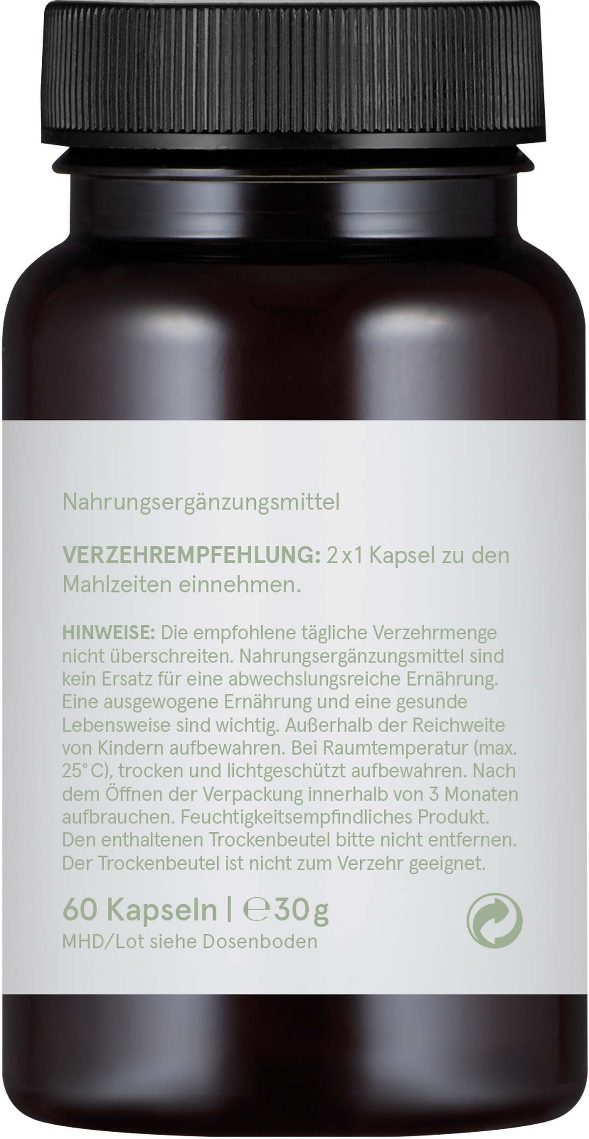 Warnheinweise: Nahrungsergänzungsmittel stellen keinen Ersatz für abwechslungsreiche Ernährung dar. Eine ausgewogene Ernährung und gesunde Lebensweise sind wichtig. Die empfohlene tägliche Verzehrmenge nicht überschreiten. Außerhalb der Reichweite von kleinen Kindern au, Nicht geeignet für Kinder, Schwangere und Stillende. Personen mit bestehenden Erkrankungen oder unter ärztlicher Behandlung sollten vor dem Verzehr ärztlichen Rat einholen.