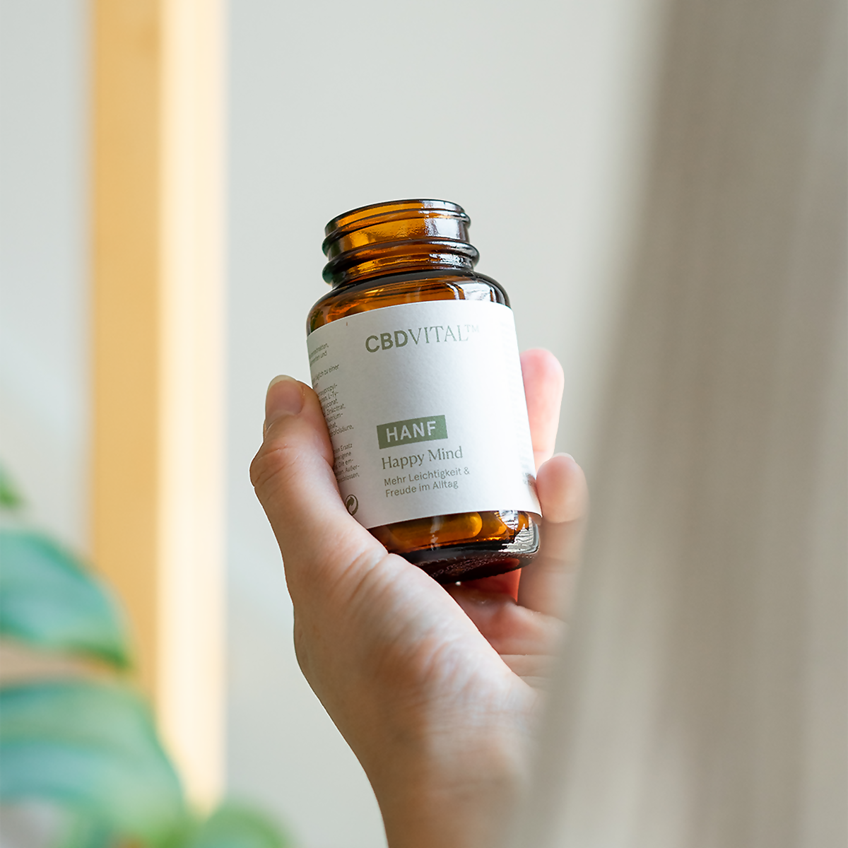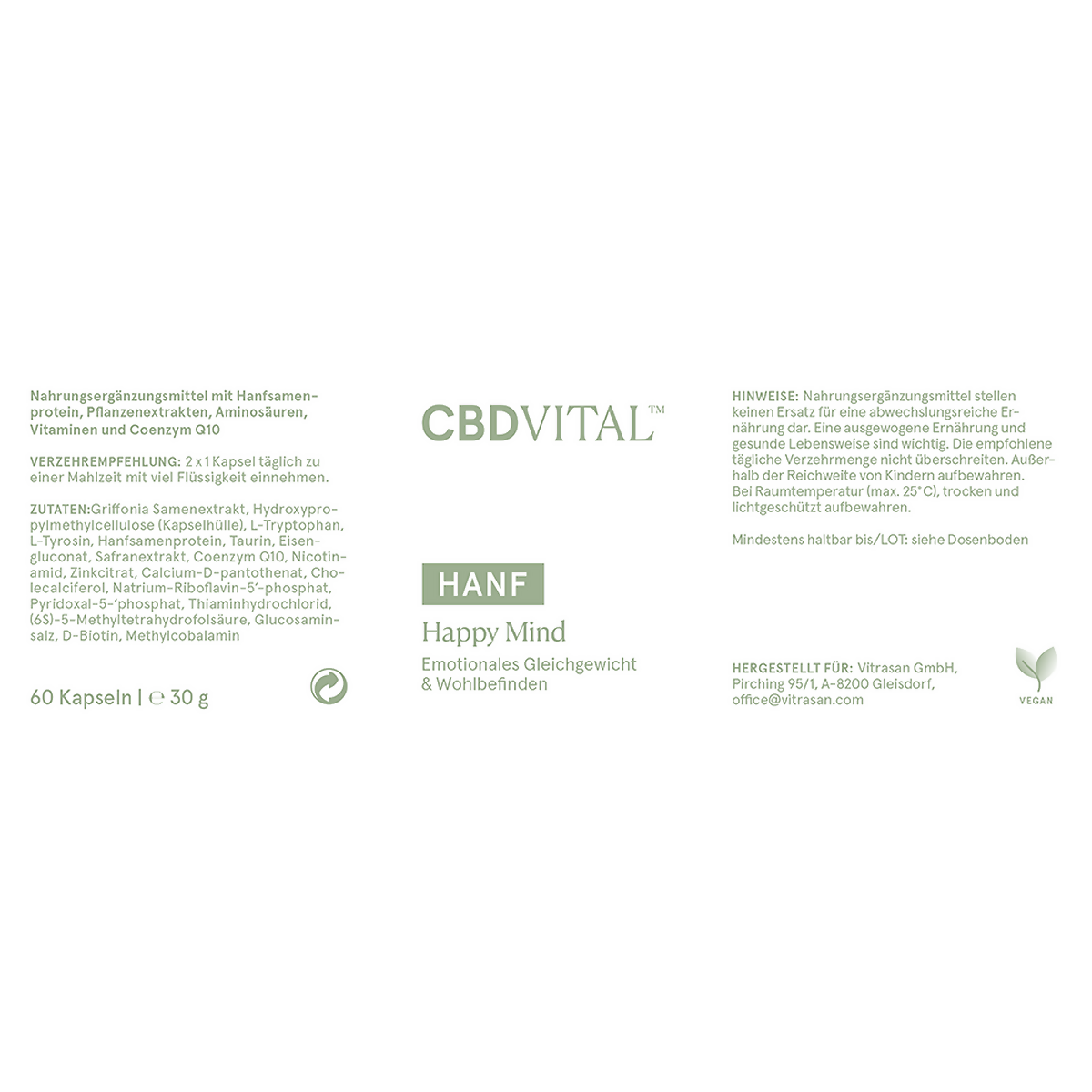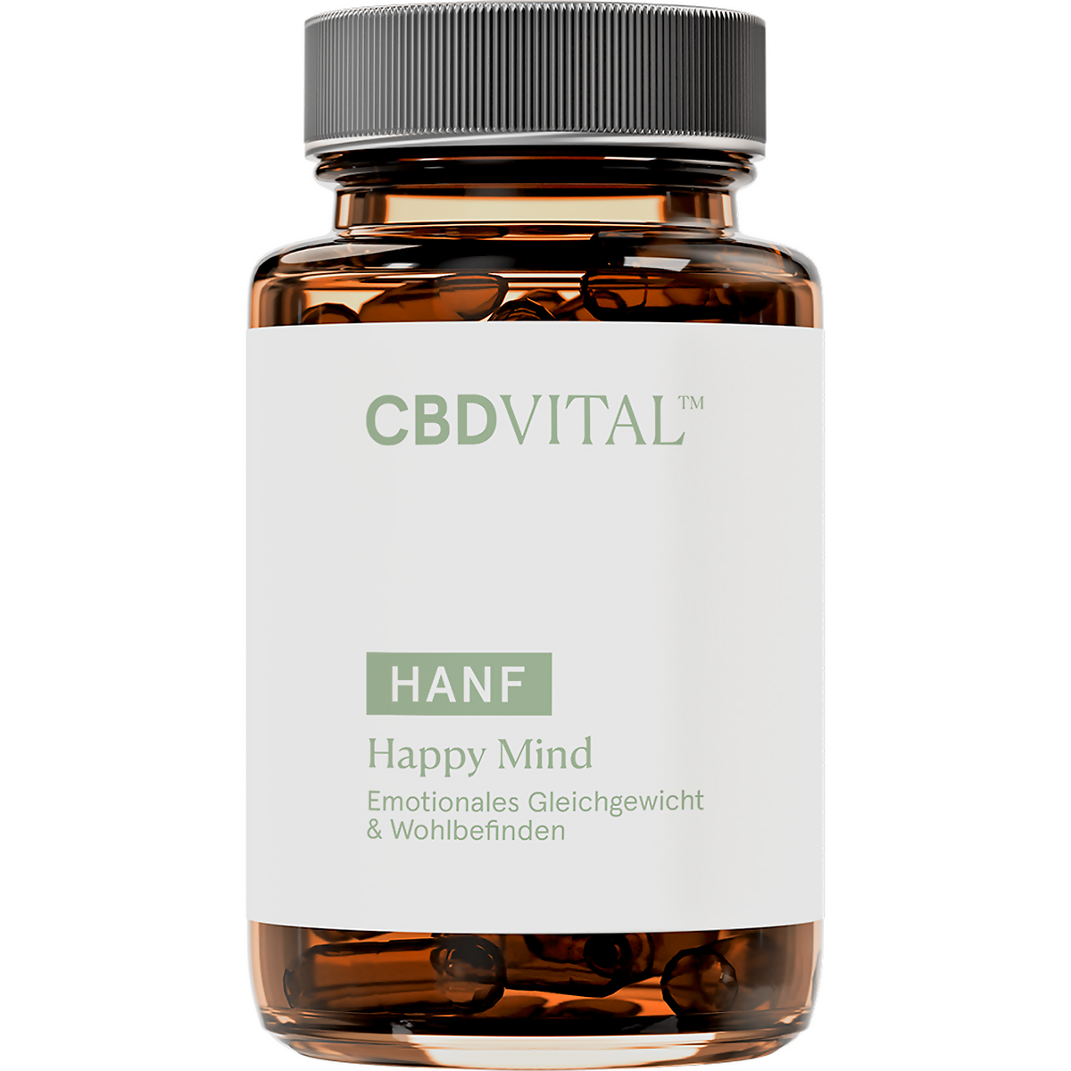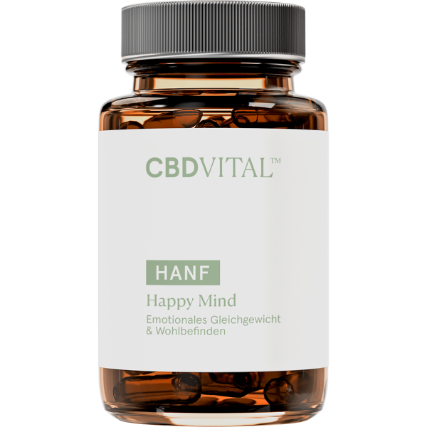 Hanf Happy Mind von CBD VITAL ist eine einzigartige Formel aus ausgewählten Mikronährstoffen und pflanzlichen Inhaltsstoffen. Das synergistische Zusammenspiel zwischen speziellen Aminosäuren, Vitaminen, Spurenelementen sowie Hanfblättern und erlesenen Pflanzenextrakten erfüllt die Voraussetzungen für mehr Leichtigkeit im Alltag. Die Aminosäure L-Tryptophan ist ein Baustoff, der für die körpereigene Bildung von Serotonin benötigt wird. 5-Hydroxytryptophan (5-HTP) fungiert als direkte Vorstufe von Serotonin und wird aus der Schwarzbohne (Griffonia) gewonnen. Die Aminosäure L-Tyrosin ist ein Ausgangsstoff für die aktivierenden Neurotransmitter und sorgt gemeinsam mit Eisen für Power und Elan im CBD VITAL Hanf Happy Mind Komplex. Aktivierte B-Vitamine (ideal dosiert) werden optimal vom Körper aufgenommen und sind wichtig für eine normale Nervenfunktion. Die Wirksamkeit des in den Kapseln enthaltenen Safranextrakts (Saffr‘ Activ®) zum Abbau von Stress und bei leichten seelischen Problemen wurde in mehreren klinischen Studien bestätigt.