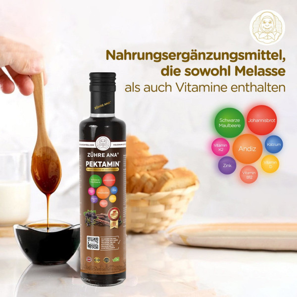 Zühre Ana Pektamin Sirup ist eine geschmackvolle und vielseitige Ergänzung für Ihren täglichen Ernährungsplan. Der aromatische Sirup kombiniert den vollen Geschmack von Melasse. Ideal für den täglichen Verzehr, kann dieser Sirup als Süßstoff für Müsli, Joghurt oder Smoothies verwendet werden. Ebenso lässt er sich mit warmen oder kalten Getränken mischen, um ihnen eine besondere Geschmacksnote zu verleihen. Dank seiner angenehmen Konsistenz eignet er sich hervorragend zum Verfeinern von Desserts, Gebäck oder Pfannkuchen. Mit seiner einfachen Dosierung und seinem intensiven Geschmack ist der Pektamin Sirup eine großartige Wahl für alle, die ihren Gerichten eine köstliche und vielseitige Zutat hinzufügen möchten.