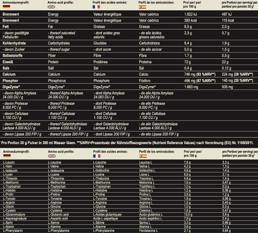 Milcheiweiß (Molkeneiweißkonzentrat, Emulgator (Lecithine)) 93,3%, Verdickungsmittel (Xanthan), Aroma, DigeZyme® Multienzym Komplex (Füllstoff Maltodextrin, Alpha Amylase, Protease, Cellulase, Galactohydrolase Lactase, Lipase), Säuerungsmittel (Citronensäure), Süßungsmittel (Sucralose).