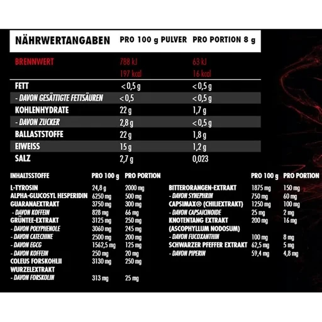 Nährwerte pro Portion (8g) pro 100g Brennwert 16 kcal 197 kcal Fett 0,5 g 0,5 g - davon gesättigt 0,5 g 0,5 g Kohlenhydrate 1,7 g 22 g - davon Zucker 0,5 g 2,8 g Ballaststoffe 1,8 g 22 g Eiweiß 1,2 g 15 g Salz 0,023 g 2,7 g L-Tyrosine 2000 mg 24,8 g Alpha Glucosyl Hesperide 500 mg 6250 mg Guaranaextrakt 300 mg 3750 mg - davon Koffein 66 mg 828 mg Grüntee Extrakt 250 mg 3125 mg - davon Polphenole 245 mg 3060 mg - davon Catechine 200 mg 2500 mg - davon Egcg 125 mg 1562,5 mg - davon Koffein 20 mg 250 mg Coleus Forskohlii 250 mg 3130 mg Wurzelextrakt - davon Forskolin 25 mg 313 mg Bitterorange Extrakt 1875 mg 1875 mg - davon Synephrin 750 mg 750 mg Chilieextrakt 1250 mg 1250 mg - davon Capsainoide 25 mg 2 mg Knotentang Extrakt 200 mg 16 mg - davon Fucoxanthin 100 mg 8 mg Schwarzer Pfeffer Extrakt 62,5 mg 5 mg - davon Piperin 59,4 mg 4,8 mg