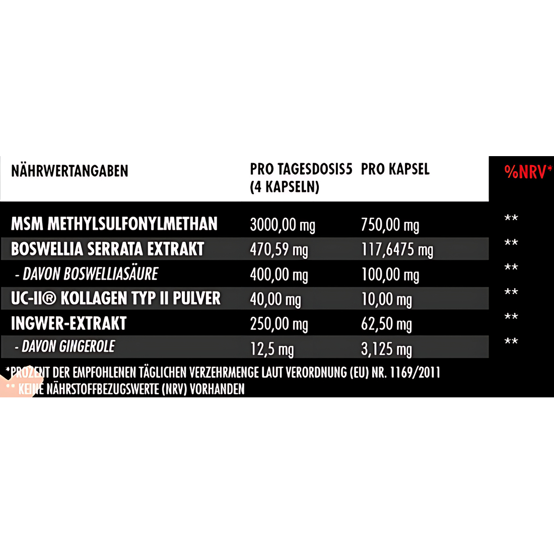 Nährwertangaben pro Tagesdosis (4 Kapseln): MSM METHYLSULFONYLMETHAN 3000,00 mg BOSWELLIA SERRATA EXTRAKT 470,59 mg - AVON BOSWELLIASÄURE 400,00 mg UC-II® KOLLAGEN TYP II PULVER 40,00 mg INGWER-EXTRAKT 250,00 mg - DAVON GINGEROLE 12,5 mg