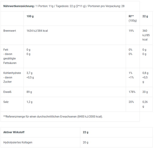 hydrolysiertes Kollagen 91%, Säuerungsmittel (Citronensäure), Aromen, Maltodextrin, Rote Bete-Konzentrat-Pulver [Maltodextrin, Rote Bete-Konzentrat, Säuerungsmittel (Citronensäure)], Süßungsmittel (Sucralose), Speisesalz, Farbstoff (Echtes Karmin).