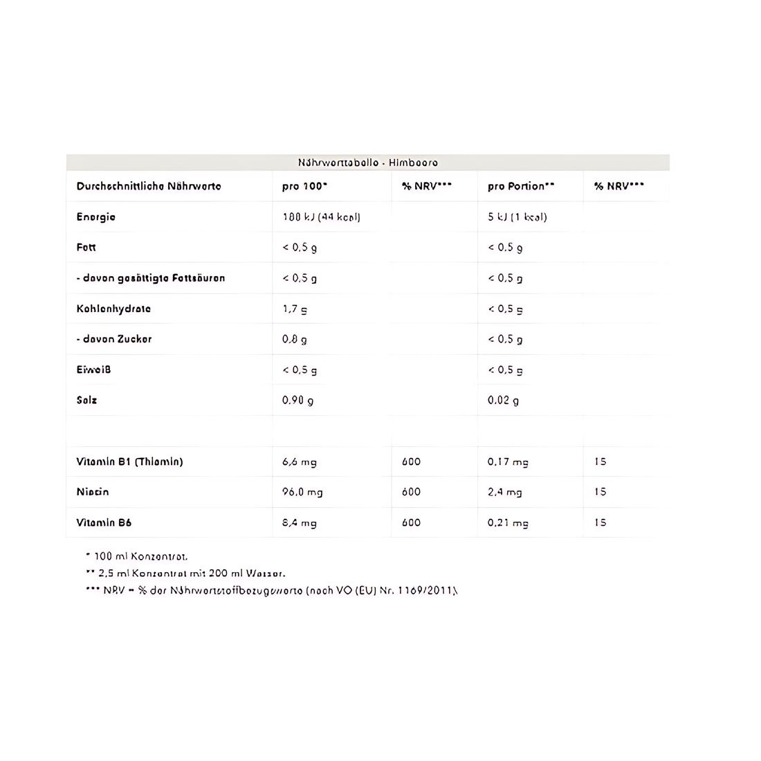 Durchschnittliche Nährwerte pro 100* % NRV*** pro Portion** % NRV*** Energie 234 kJ (55 kcal) 6 kJ (1 kcal) Fett < 0,5 g < 0,5 g - davon gesättigte Fettsäuren < 0,5 g < 0,5 g Kohlenhydrate 0,6 g < 0,5 g - davon Zucker 0,6 g < 0,5 g Eiweiß < 0,5 g < 0,5 g Salz 0,98 g 0,02 g Vitamin B1 (Thiamin) 6,6 mg 600 0,17 mg 15 Niacin 96,0 mg 600 2,4 mg 15 Vitamin B6 8,4 mg 600 0,21 mg 15 * 100 ml Konzentrat. ** 2,5 ml Konzentrat mit 200 ml Wasser. *** NRV = % der Nährwertstoffbezugswerte (nach VO (EU) Nr. 1169/2011).