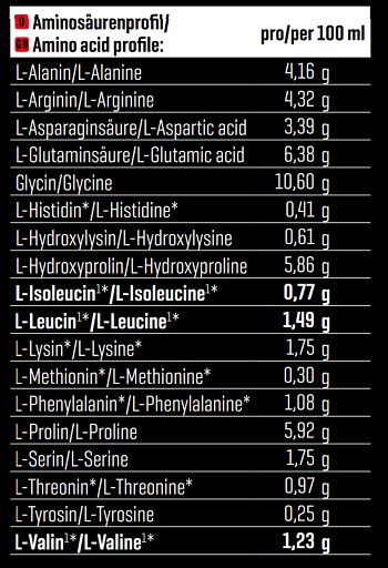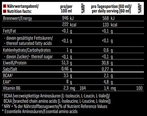 Lust auf ordentlich Beef-Power? Die BODY ATTACK Beef Liquid Aminos haben es in sich – nämlich hochwertige flüssige Aminosäuren aus Rinder Protein. Dein Vorteil? Rund 4800 mg essentielle Aminosäuren (EAA) und 2100 mg BCAA stecken in den Fertigdrinks pro 60 ml für deine eiweißbetonte Ernährung. Und bei so einem satten Proteingehalt von ca. 30 g Eiweiß pro Tagesration sehen deine Muskeln förmlich rot beim Workout. Na los! Der ideale Treibstoff für deine Muskelaufbau-Ziele wartet schon. Mit zusätzlichem Vitamin B6* hältst du stierisch länger durch am Eisen. Bist du bereit durchzustarten? Für dich von uns bereitgestellt in zwei fruchtig leckeren Geschmackssorten.