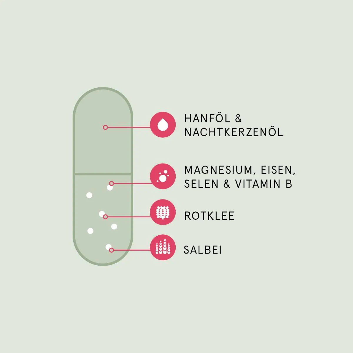 Hanföl*, Nachtkerzenöl, Hydroxypropylmethylcellulose (Kapselhulle, Fullstoff), Maisstarke (Fullstoff), Rotklee-Extrakt, Magnesiumoxid, D-alpha-Tocopherolol, Salbei-Extrakt, Niacin, Pyridoxinhydrochlorid, Pantothensaure, Eisen, Ribofavin, Biotin, Folsaure, Selen, Cyanocobalamin. THC nicht nachweisbar (nach HPLC-DAD).