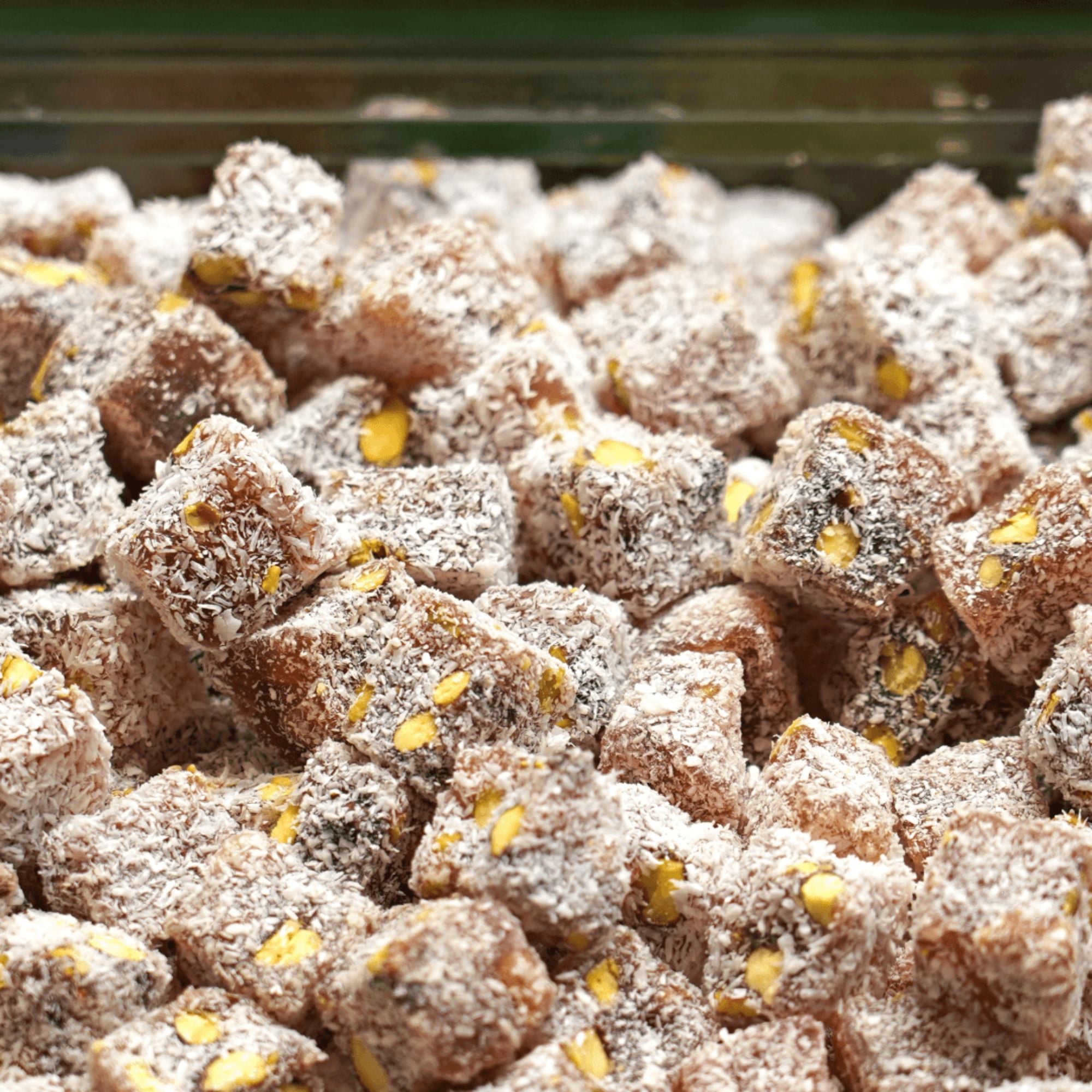 Erleben Sie den intensiven Geschmack von doppelt geröstetem Turkish Delight Lokum mit Pistazien und Kokosnuss. Diese exquisite Süßigkeit kombiniert die zarte Textur von Lokum mit dem nussigen Aroma von Pistazien und der exotischen Note von Kokosnuss. Perfekt als besonderer Genuss oder als Geschenk für Feinschmecker.