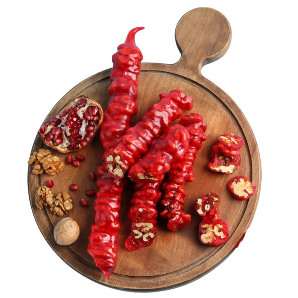 Diese traditionelle türkische Süßigkeit kombiniert den kräftigen Geschmack von Walnüssen mit dem fruchtigen Aroma von Granatapfel. Im Inneren befinden sich ganze Walnüsse, die von einer aromatischen Masse umhüllt sind und für ein ausgewogenes Geschmackserlebnis sorgen.