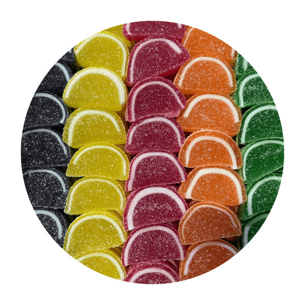 Zucker, Glukosesirup, natürliches Aroma (je nach Sorte), Zitronensäure (E330), Verdickungsmittel (Pektin), Farbstoffe (je nach Sorte): Gelb E110, Grünmischung E102, E132, Ponceau 4R, E124, Tartrazin E102