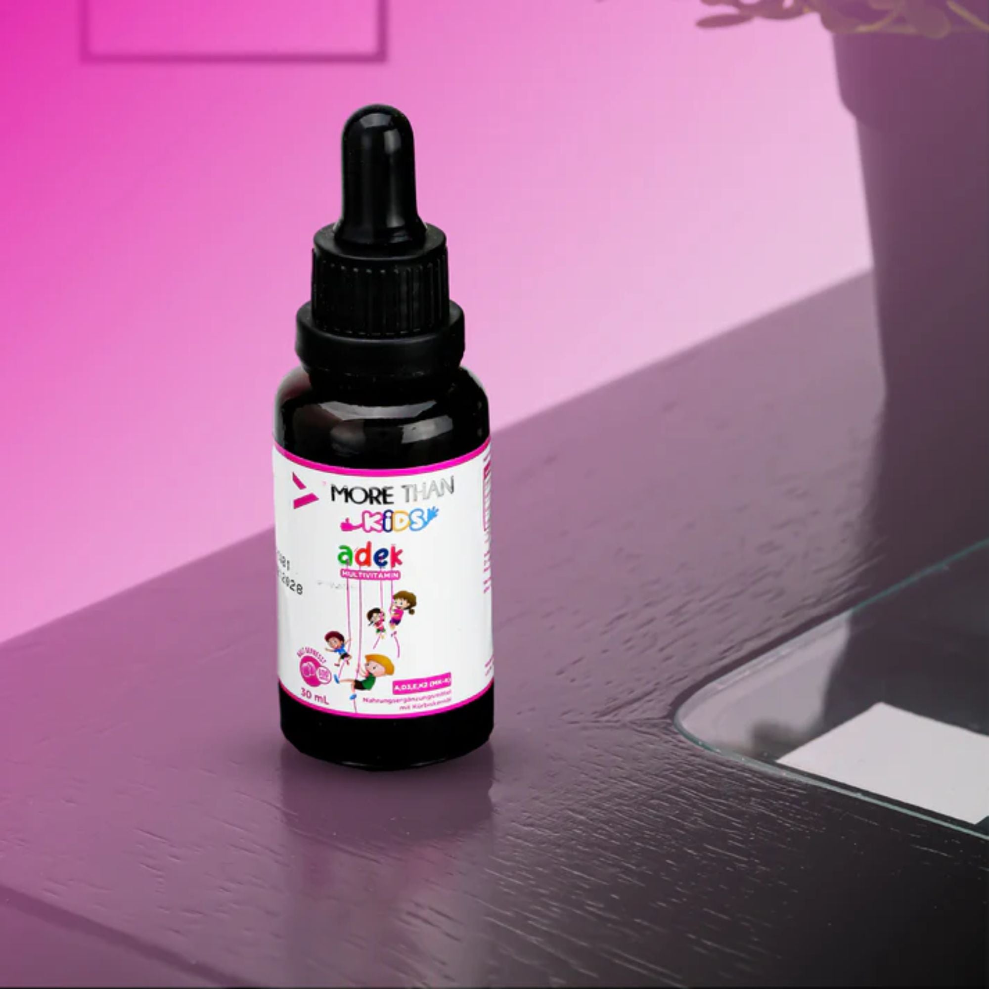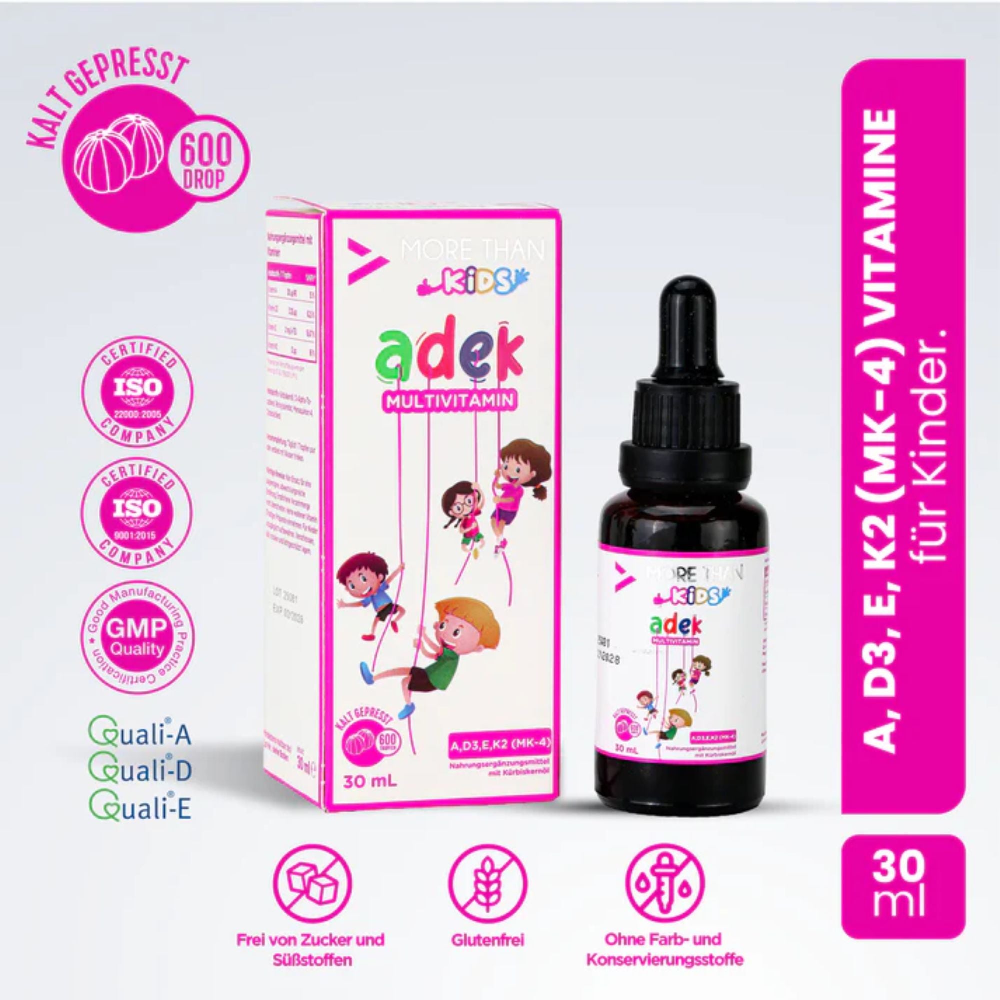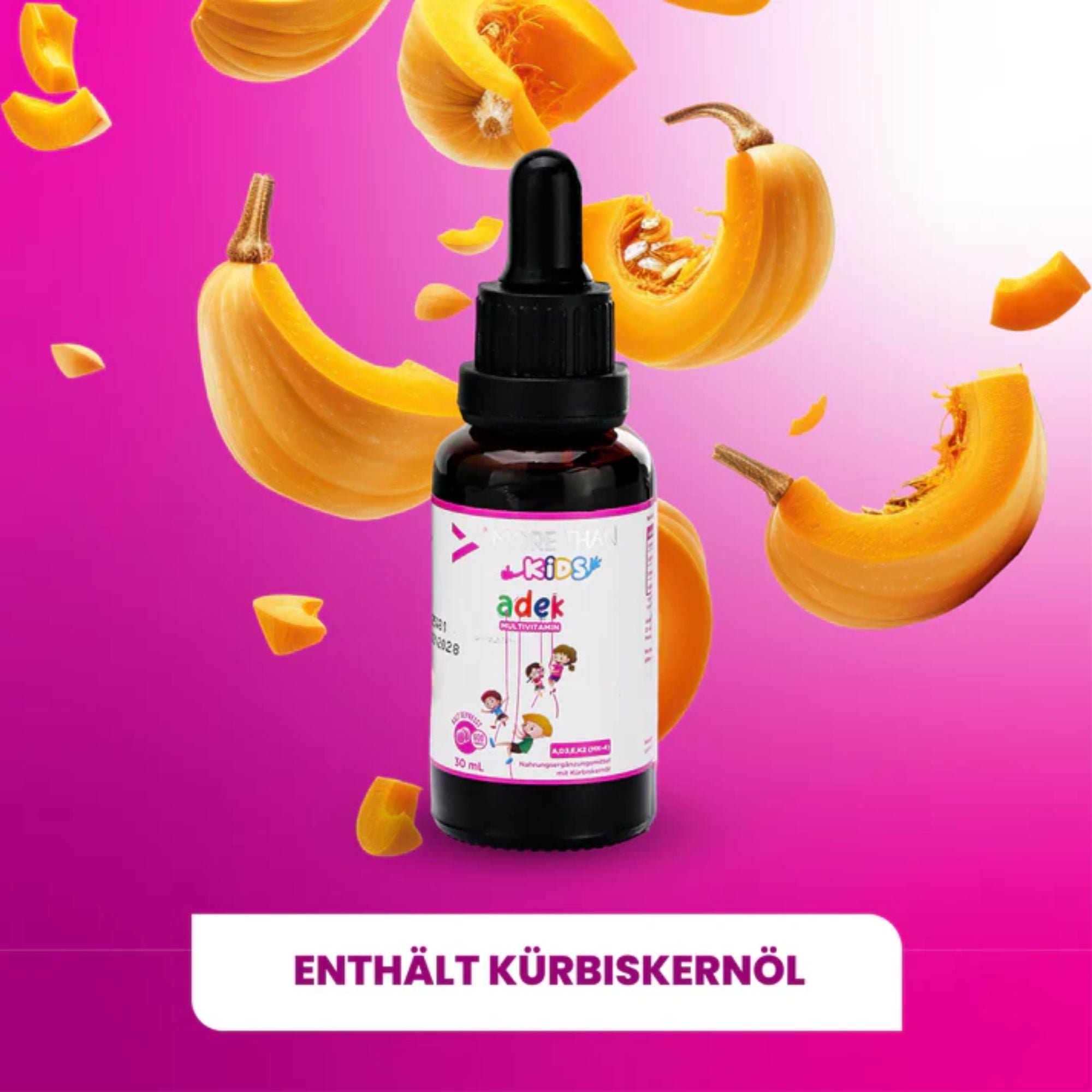 Kids ADEK ist ein Multivitaminpräparat speziell für Kinder, das die Vitamine A, D3, E und K2 (MK-4) enthält. Das Produkt basiert auf Kürbiskernöl und wird in Tropfenform angeboten.