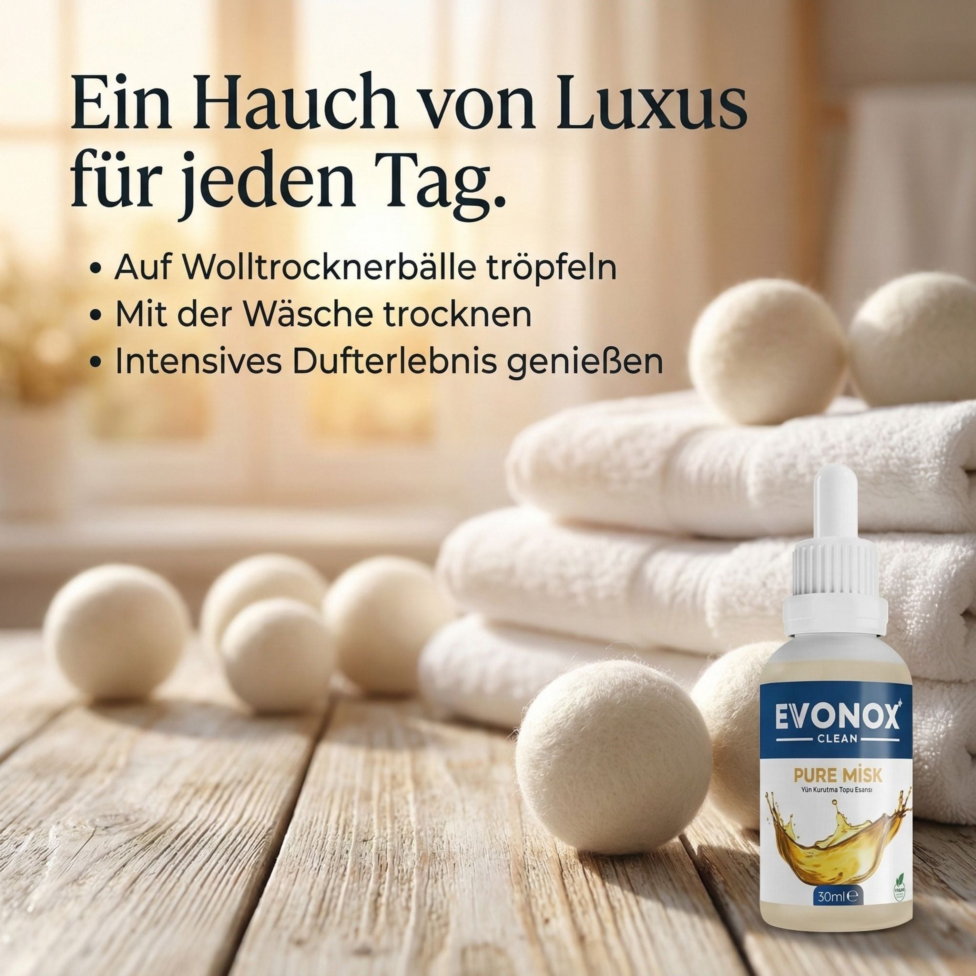 Evonox Clean | Pure Misk Duftessenz für Wolltrocknerbälle 30ml
