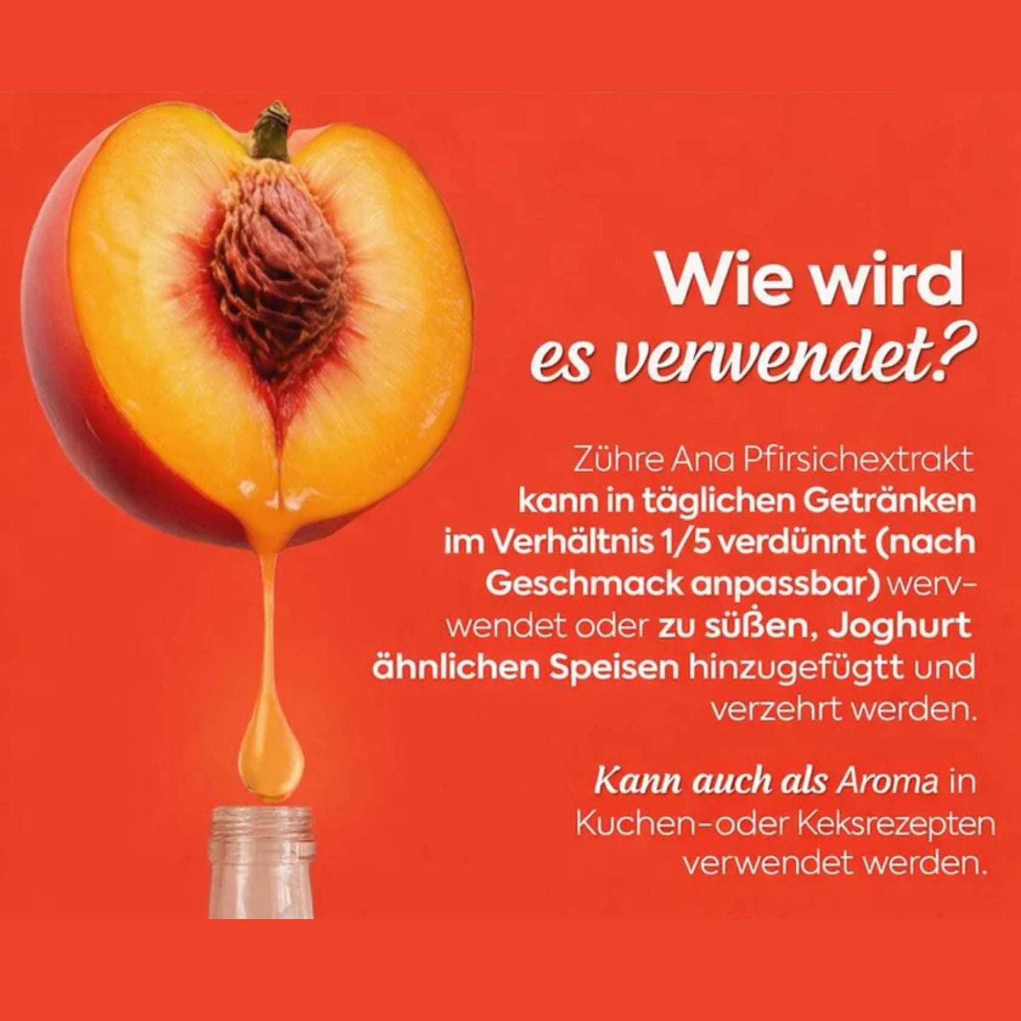 Pfirsichextrakt ist ein flüssiger Fruchtextrakt mit fruchtig-süßem Geschmack. Er kann in Getränken mit heißem oder kaltem Wasser im Verhältnis 1:5 verdünnt und individuell dosiert werden.
