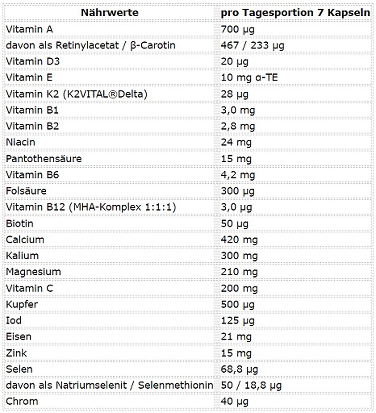 Nährstoffe / Zusammensetzung Pro Tagesportion Vitamin C 200 mg Niacin 24 mg Pantothensäure 15 mg Vitamin E 9,8 mg α-TE Vitamin B6 4,2 mg Thiamin 3,0 mg Riboflavin 2,8 mg Vitamin A 467 μg RE davon als Retinylacetat 419 μg davon als ß-Carotin 47 μg RE Folsäure 300 µg Biotin 50 µg Vitamin K 28 μg Vitamin D 20 µg Vitamin B12 2,9 μg Mineralstoffe / Mineralien Pro Tagesportion Calcium 419 mg Kalium 300 mg Magnesium 210 mg Eisen 21 mg Zink 15 mg Mangan 0,97 mg Kupfer 0,49 mg Jod 125 µg Selen 69 µg Chrom 40 µg