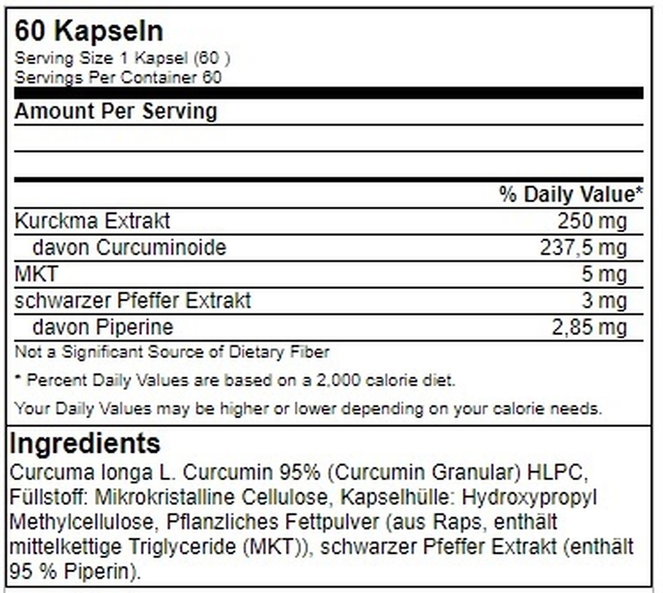 - 500mg Kurkumin Extrakt 50:1 (Tagesportion) entsprechen 25000mg reinem Kurkuma Pulver