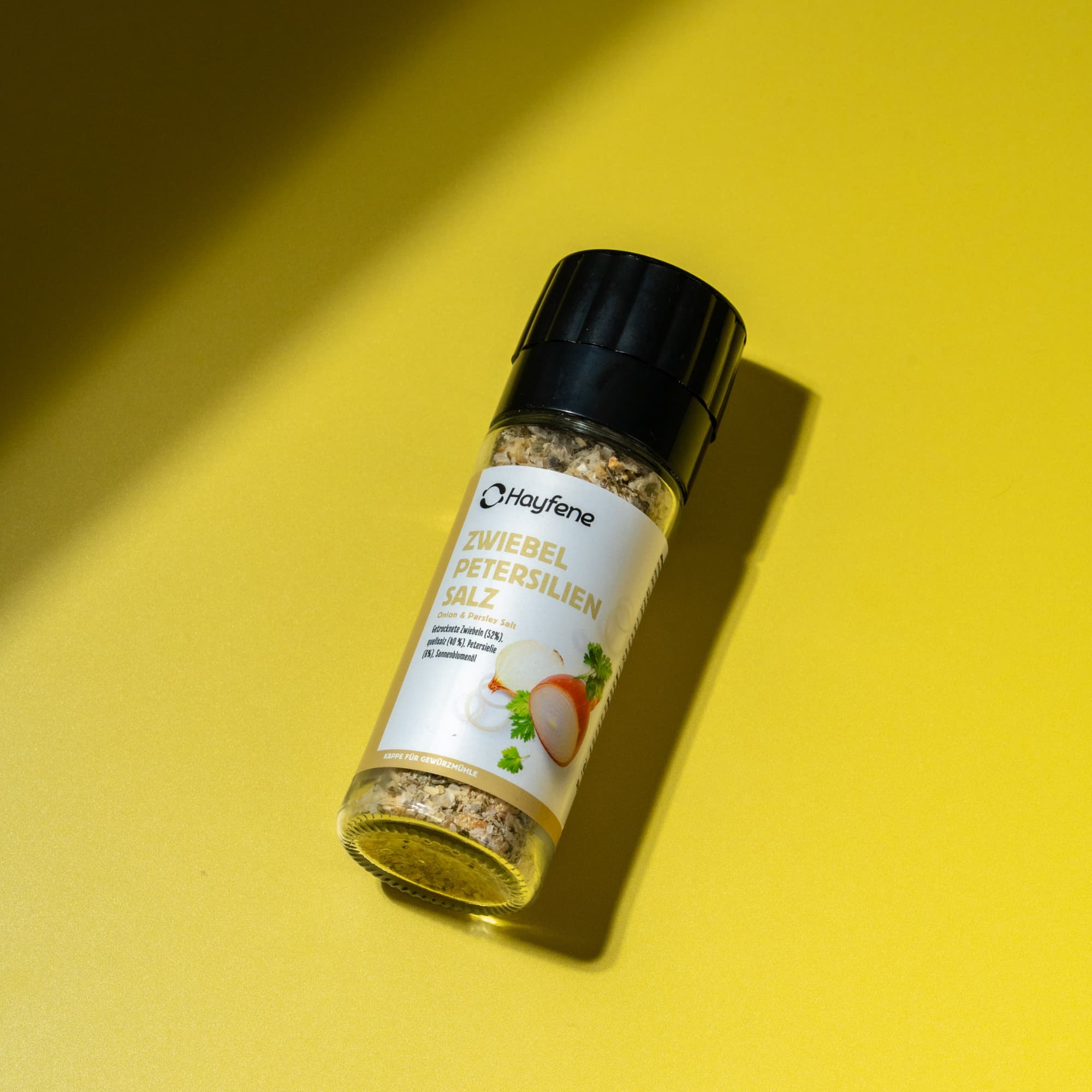 Entdecken Sie die aromatische Gewürzmischung Hayfene Salziges Gewürz mit Zwiebeln und Petersilie – sorgfältig kombiniert mit getrockneten Zwiebeln und frischer Petersilie.