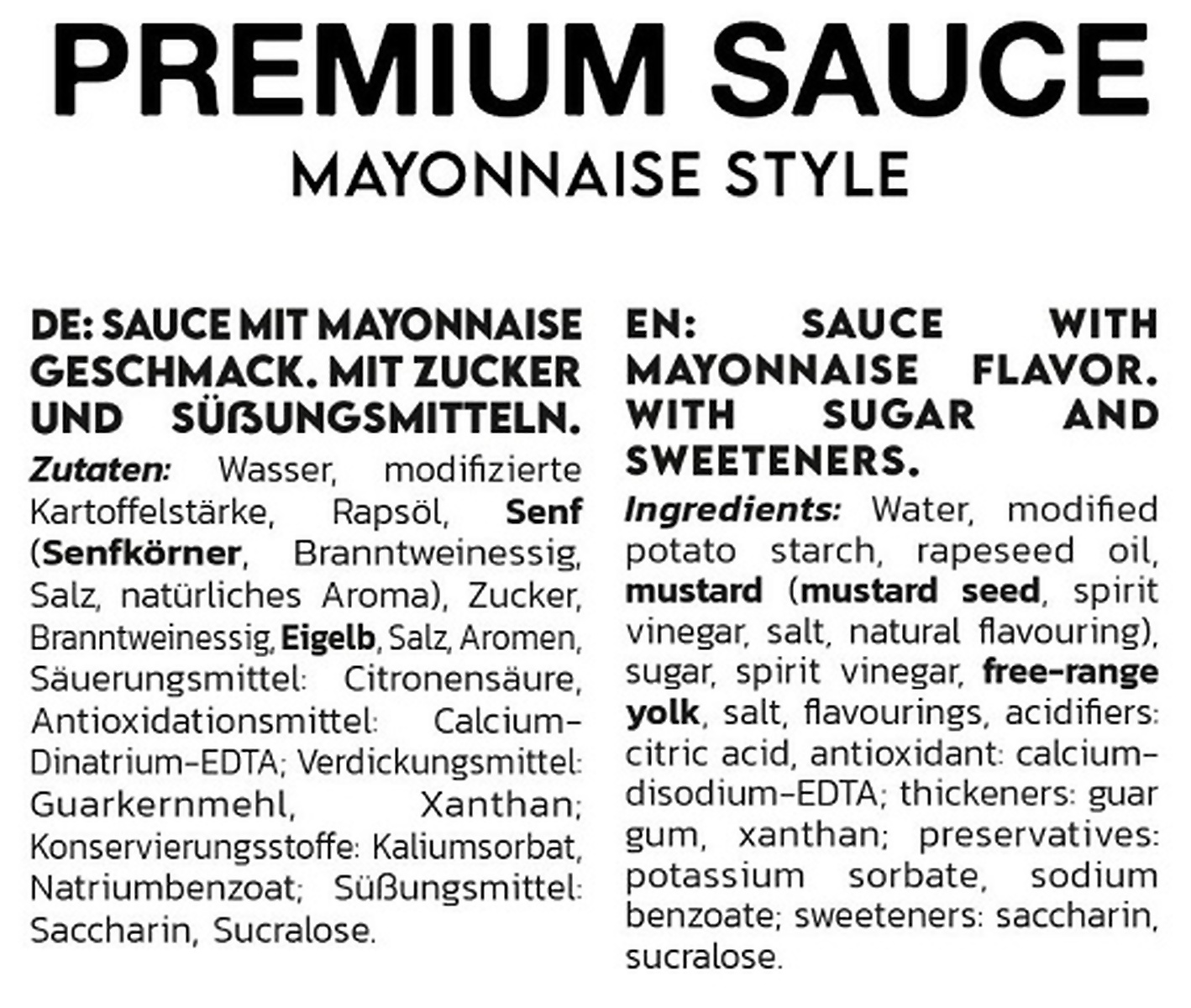 Wasser, modifizierte Kartoffelstärke, Rapsöl, Senf (Senfkörner, Branntweinessig, Salz, natürliches Aroma), Zucker, Branntweinessig, Eigelb, Salz, Aromen, Säuerungsmittel: Citronensäure, Antioxidationsmittel: Calcium- Dinatrium-EDTA; Verdickungsmittel: Guarkernmehl, Xanthan; Konservierungsstoffe: Kaliumsorbat, Natriumbenzoat; Süßungsmittel: Saccharin, Sucralose.