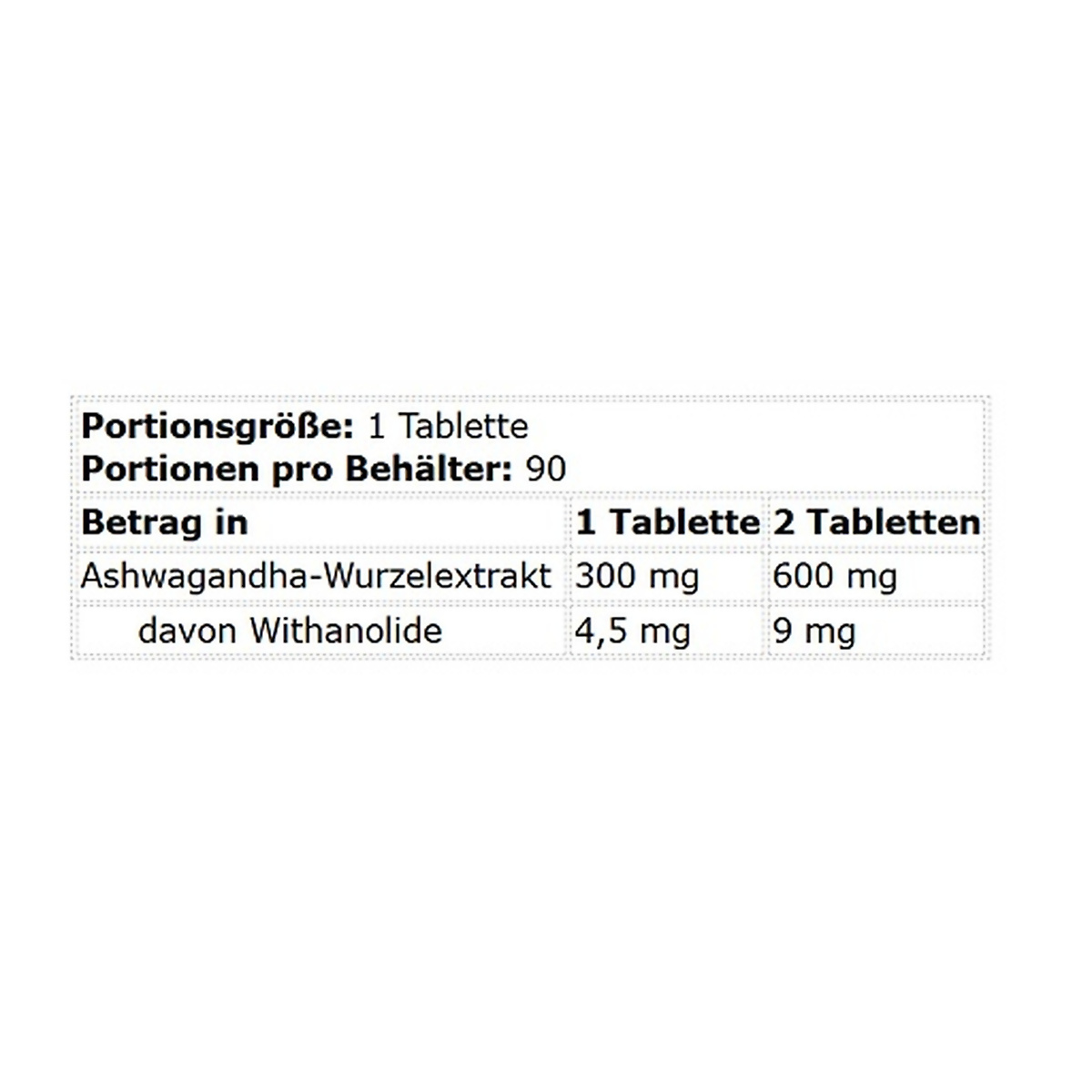 1 Tablette 2 Tabletten Ashwagandha-Wurzelextrakt 300 mg 600 mg - davon Withanolide 4,5 mg 9 mg