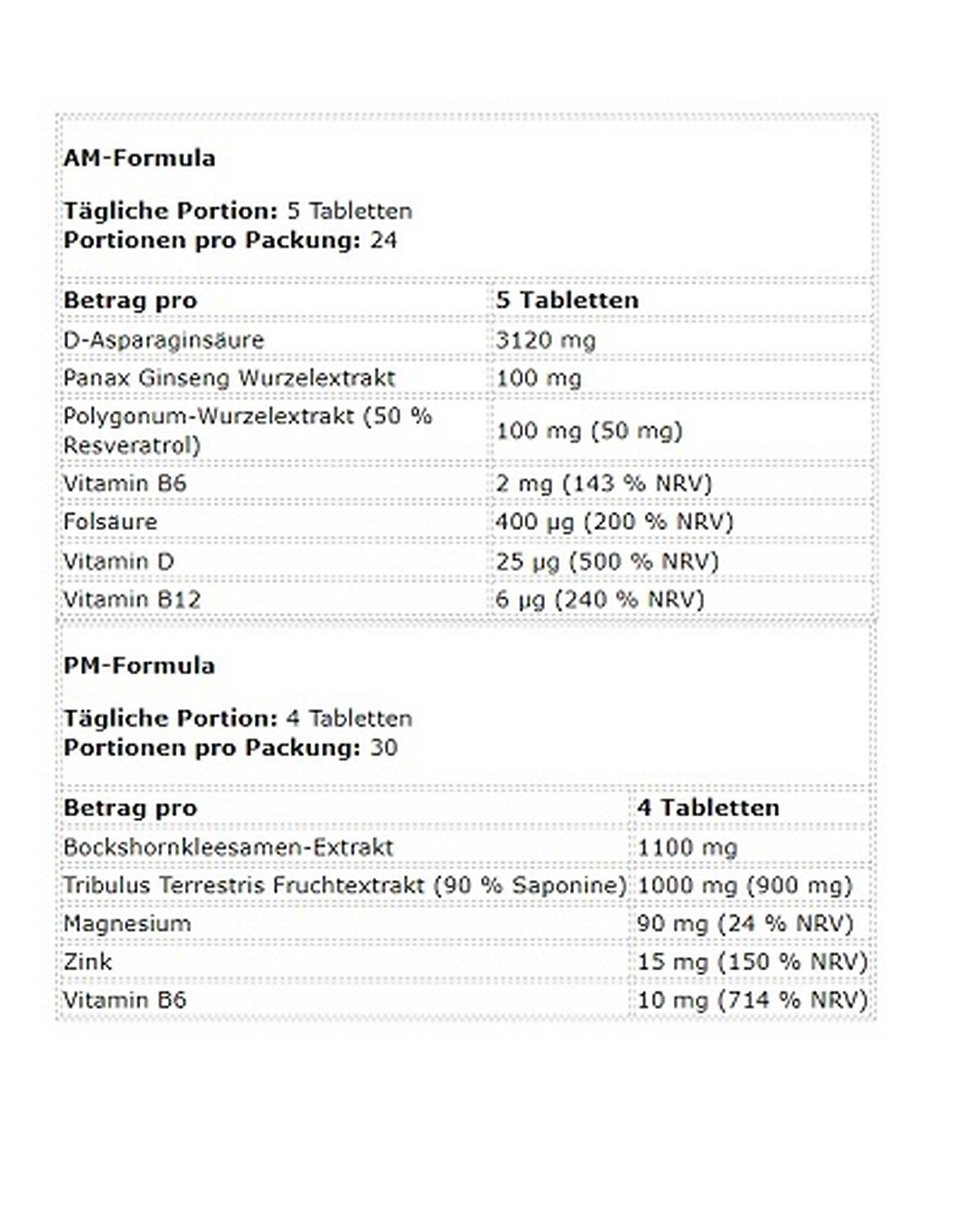D-Asparaginsäure (DAA), Füllstoffe (E460(i), E341), Maltodextrin, Festigungsmittel (E464, E422), Antiklumpmittel (E470b, E551, E553b), Panax-Ginseng-Wurzelextrakt (Panax ginseng C.A. Mey.), Polygonum-Wurzelextrakt (Fallopia japonica (Houtt). Ronse Dec.; 50% Resveratrol), Vitamin D (Cholecalciferol), Vitamin B6 (Pyridoxinhydrochlorid), Vitamin B12 (Cyanocobalamin), Folsäure (Pteroylmonoglutaminsäure), Stabilisator (E1202), Glasurmittel (E1521).