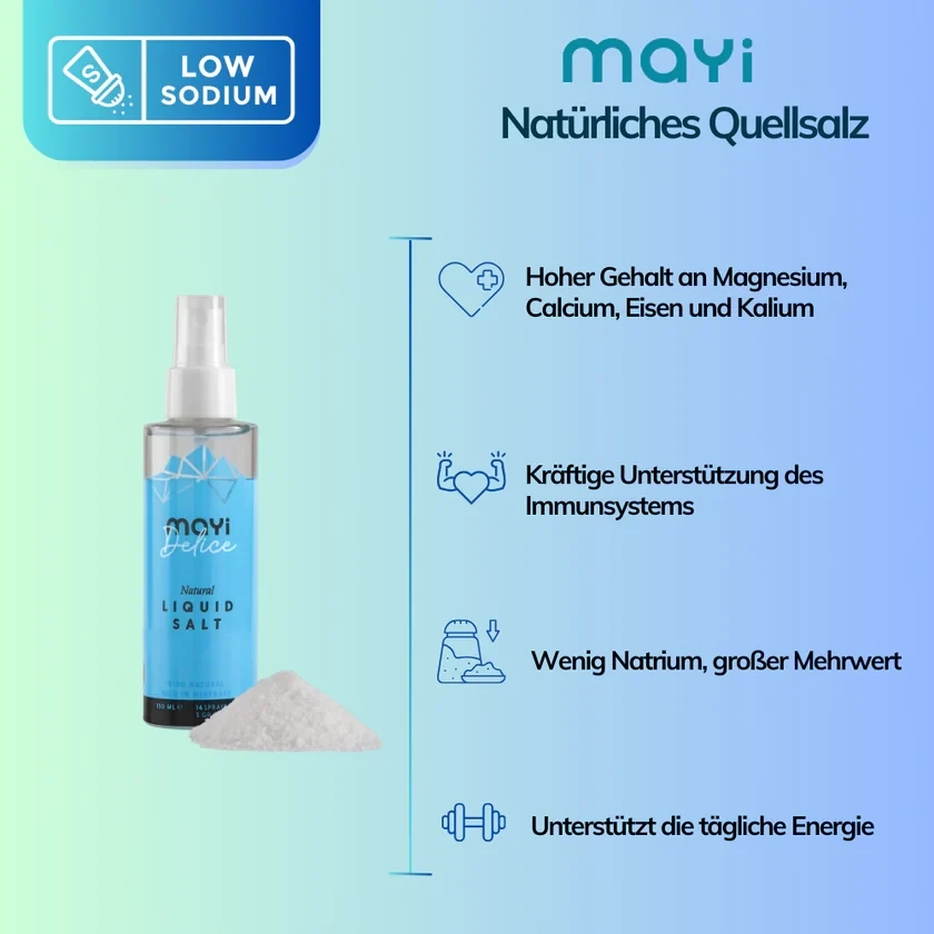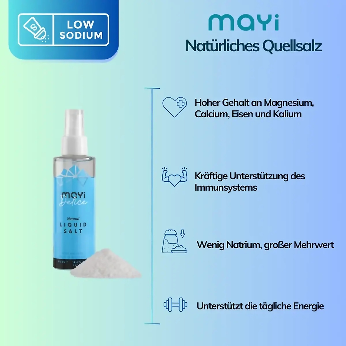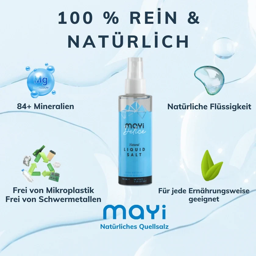 Mayi Delice Natural Liquid Salt ist ein naturbelassenes Spraysalz (150 ml), gewonnen aus mineralstoffreicher Tiefensole mit 28 % Salinität. Ohne jegliche Verarbeitung oder Zusatzstoffe – perfekt für eine feine, gleichmäßige Würze im Alltag.