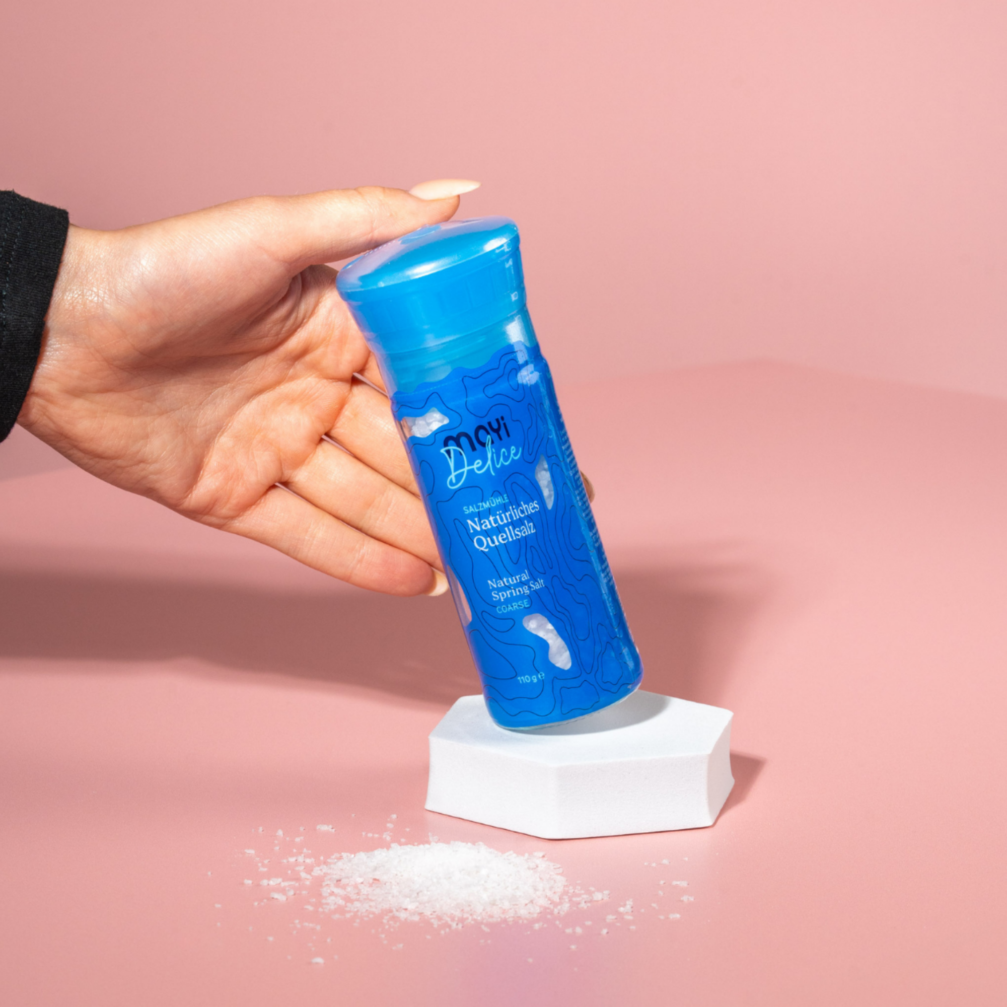 Produktinformationen "Mayi | Quellsalz grobkörnig mit Salzmühle 110g"