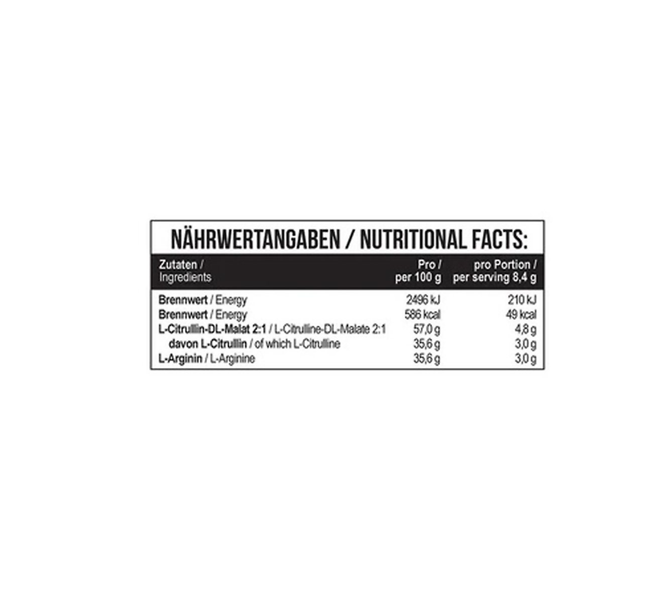 Dieser Pump-Booster enthält eine Matrix auf Basis von Arginin und Citrullin als DL-Malat. Diese beiden Aminosäuren zählen zu den effektivsten Aminosäuren um deine Stickstoffmonoxid Level nach oben zu bringen!