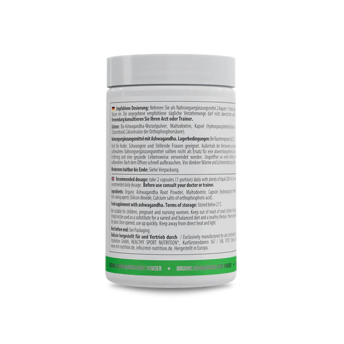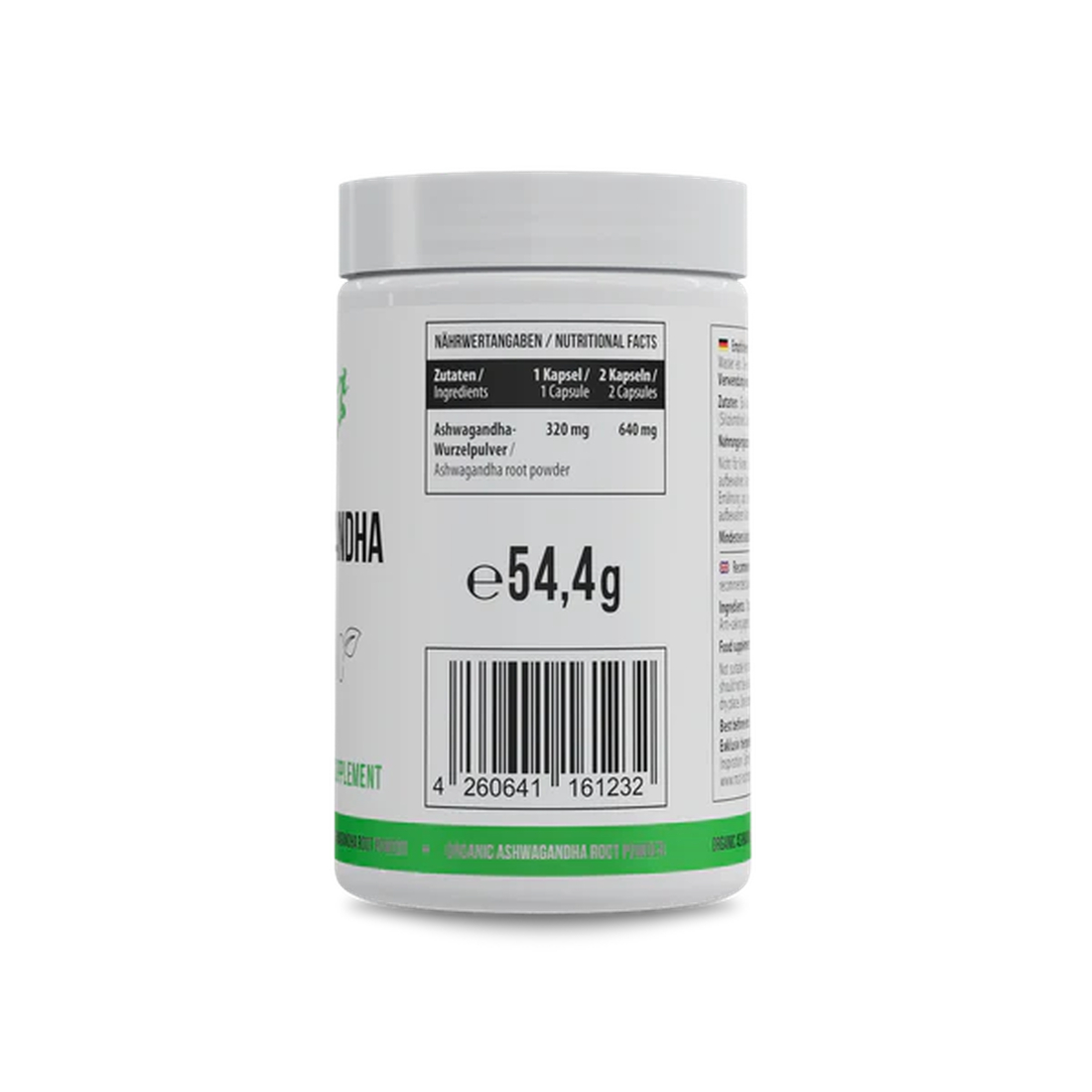 Bio-Ashwagandha-Wurzelpulver, Maltodextrin, Kapsel (Hydroxypropylmethylcellulose), Trennmittel (Siliziumdioxid, Calciumsalze der Orthophosphorsäure)