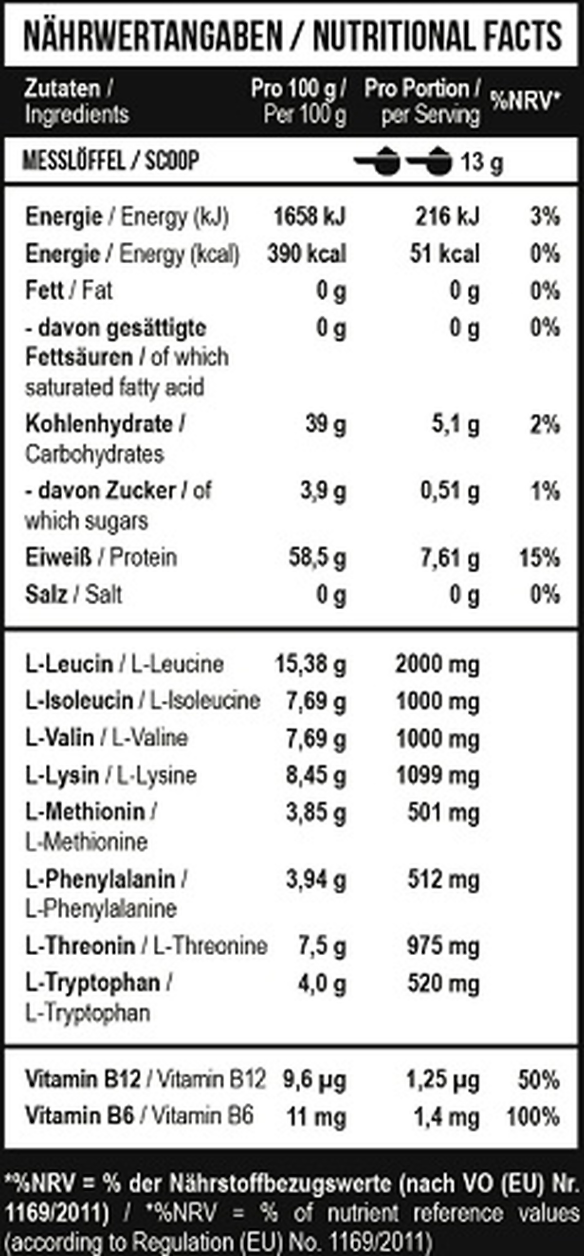 Maltodextrin, L-Leucin, L-Lysin, L-Isoleucin, L-Valin, L-Threonin, Säure (Zitronensäure), L-Tryptophan, L-Phenylalanin, L-Methionin, Aromastoffe, Süßstoff (Sucralose), Pyridoxinhydrochlorid, Cyanocobalamin.