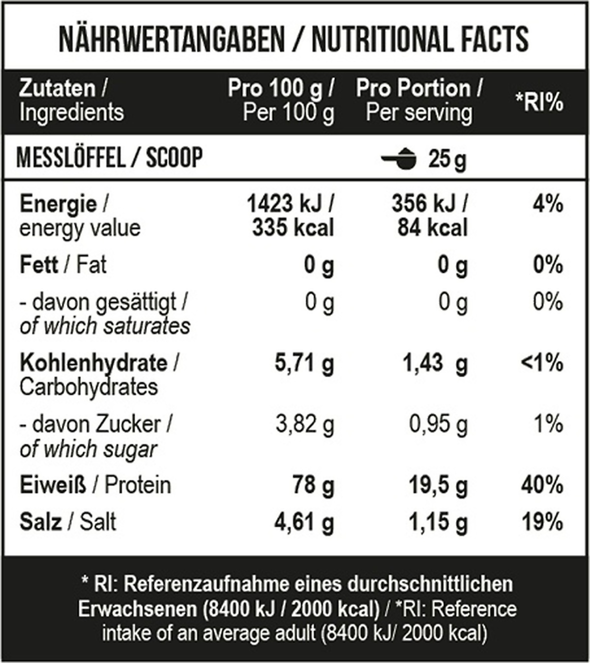 Jede Portion enthält 19,5 g schnell verwertbares Protein und nur 84 kcal. Enthält Mindestmaß an Fett und Kohlenhydrate und ist völlig zuckerfrei.