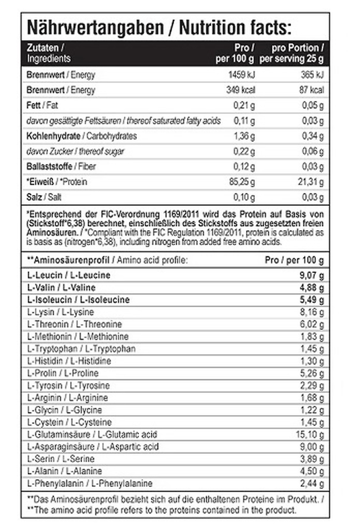 Zutaten Pro 100 g Pro Portion 25 g Brennwert 1459 kJ / 349 kcal 365 kJ / 87 kcal Fett 0,21 g 0,05 g davon gesättigte Fettsäuren 0,11 g 0,03 g Kohlenhydrate 1,36 g 0,34 g davon Zucker 0,29 g 0,06 g Ballaststoffe 0,12 g 0,03 g Eiweiß 85,25 g 21,31 g Salz 0,10 g 0,03 g