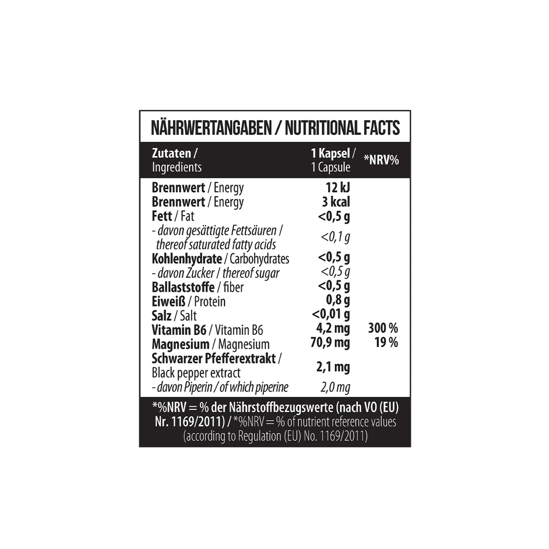 • Brennwert 12 kJ / 3 kcal Fett <0,5 g - davon gesättigte Fettsäuren <0,1 g Kohlenhydrate <0,5 g - davon Zucker <0,5 g Ballaststoffe <0,5 g Eiweiß 0,8 g Salz <0,01 g Vitamin B6 4,2 mg (300 % NRV) Magnesium 70,9 mg (19 % NRV) Schwarzer Pfefferextrakt 2,1 mg - davon Piperin 2,0 mg