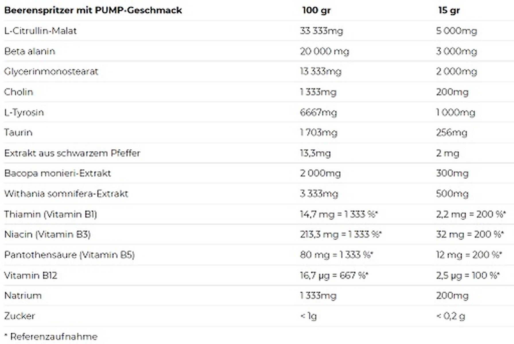 L-Citrullinmalat, Beta-Alanin, Glycerinmonostearat, L-Tyrosin, Taurin, Trennmittel Siliciumdioxid, Cholin L-Bitartrat, Withania somnifera-Extrakt (5 % Withanolide), Natriumcitrat, Bacopa monnieri-Extrakt, Natriumchlorid, Trennmittel Calciumphosphat, Aroma, Süßstoffe Sucralose und Steviolglykoside, Nicotinamid, Calcium-D-Pantothenat, Thiaminhydrochlorid, Extrakt aus schwarzem Pfeffer (95 % Piperin) - Bioperine®, Farbstoff Brillantblau FCF, Cyanocobalamin. Kann Spuren von Soja- und Milcheiweiß enthalten.