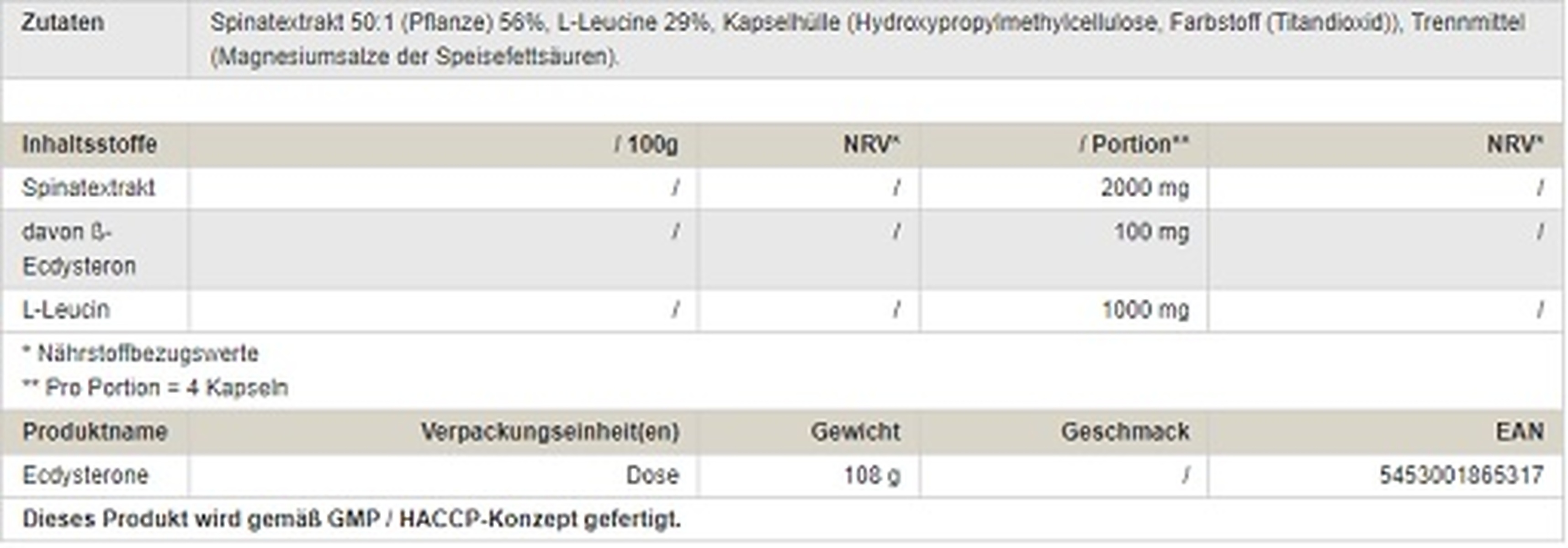Eine Kapsel liefert 25 mg Ecdysteron aus Spinatextrakt sowie 250 mg L-Leucin, einer proteinogenen Aminosäure, die natürlicherweise in eiweißhaltigen Lebensmitteln enthalten ist.