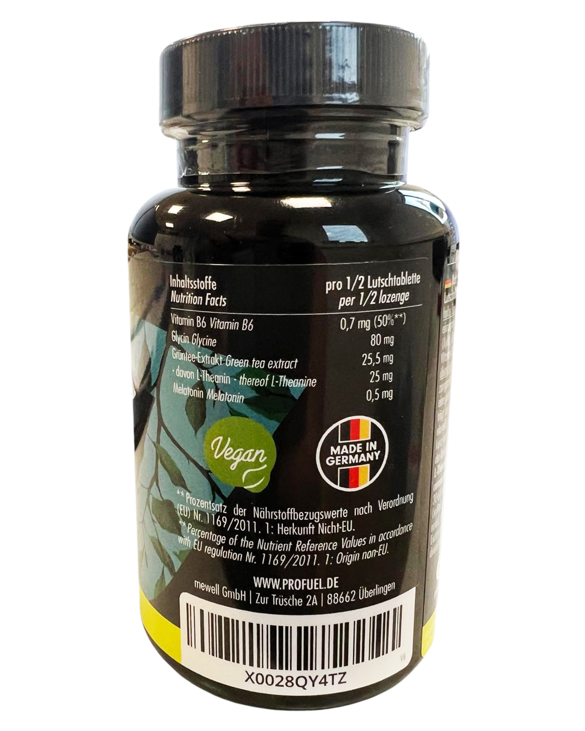 Inhaltsstoffe pro 1/2 Lutschtablette Glycin 78 mg Grüntee-Extrakt 62,5 mg - davon L-Theanin 25 mg Melatonin 0,5 mg