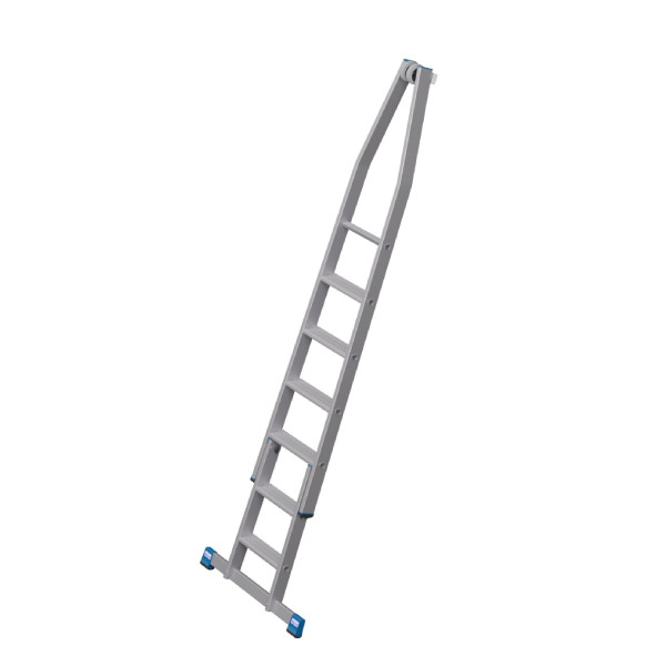 - Leiternoberteil mit Wandlaufrollen und abriebfestem Anlegeklotz aus weichem Gummimaterial mit Keilausschnitt, der an Hausecken und Fensterprofilen angelegt werden kann