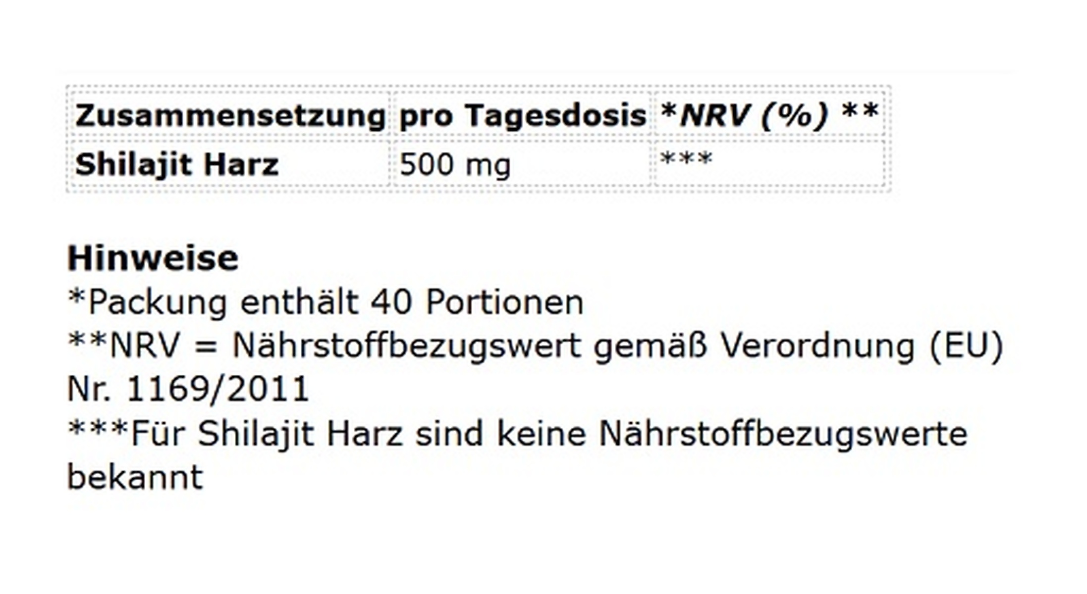 Zusammensetzung pro Tagesdosis *NRV (%) ** Shilajit Harz 500 mg *** Hinweise *Packung enthält 40 Portionen **NRV = Nährstoffbezugswert gemäß Verordnung (EU) Nr. 1169/2011 ***Für Shilajit Harz sind keine Nährstoffbezugswerte bekannt